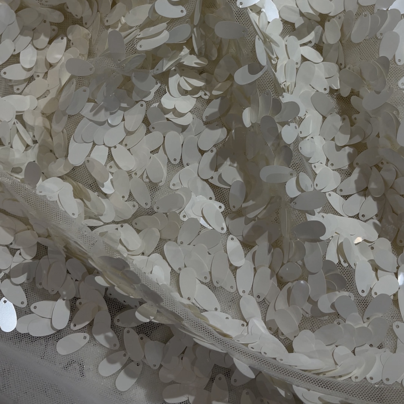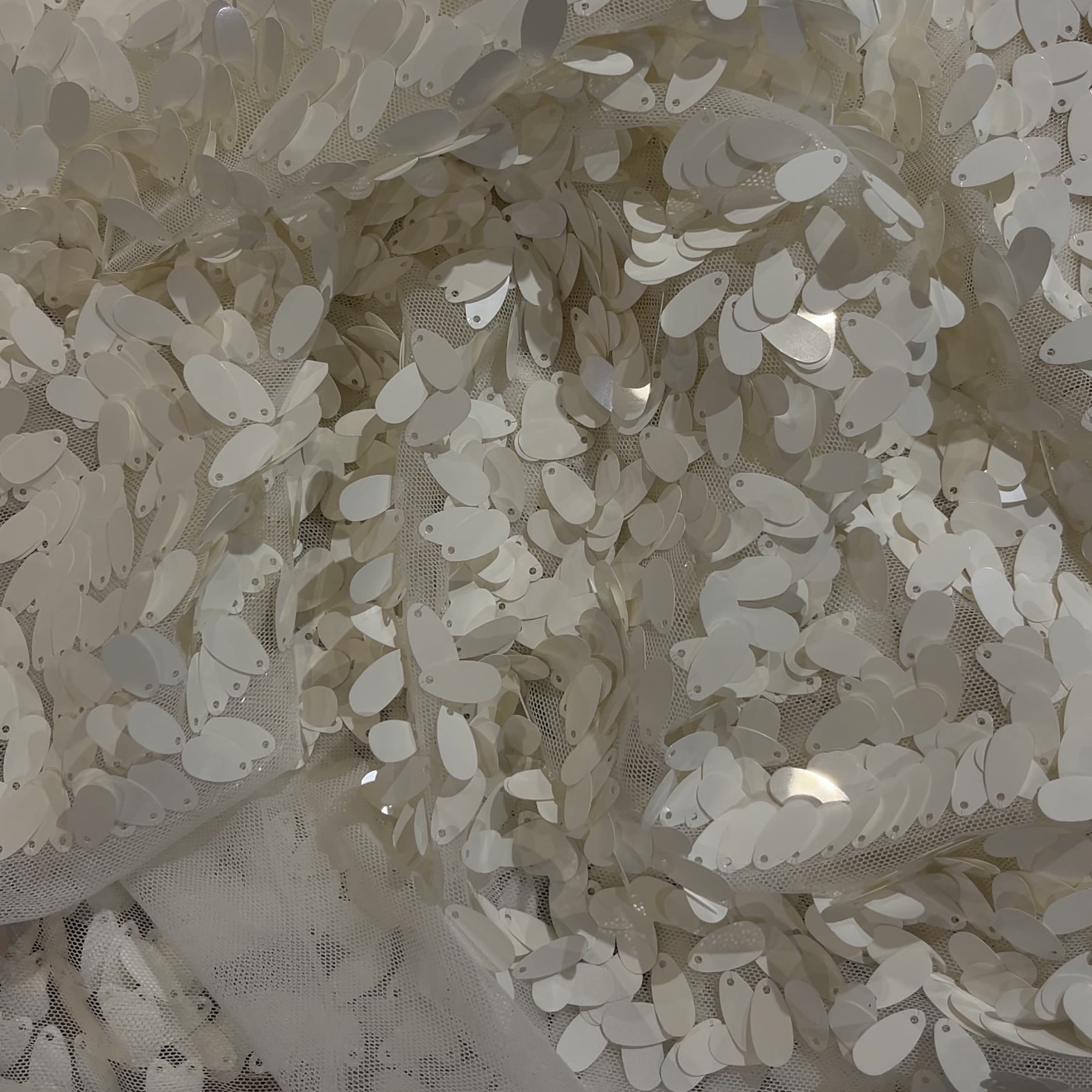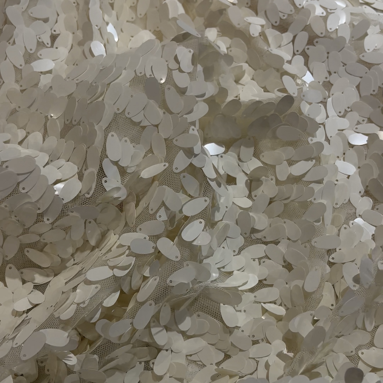 Элегантная итальянская ткань из 100% полиэстера с роскошным покрытием из пайеток нежного сливочного цвета от бренда Diffusione Tessile. Пайетки равномерно распределены по всей поверхности, создавая мягкий мерцающий эффект, который переливается перламутровыми оттенками от теплого кремового до холодного жемчужного в зависимости от освещения. Нежный сливочный цвет пайеток создает утонченный и благородный визуальный образ, идеально подходящий для создания романтичных и торжественных нарядов. Пайетки надежно закреплены на полиэстеровой основе, что обеспечивает их устойчивость к осыпанию при правильной эксплуатации. Ткань непрозрачная, не требует дополнительной подкладки, хорошо держит форму. Идеально подходит для создания свадебных платьев, вечерних нарядов, выпускных платьев, элегантных блузок и праздничных аксессуаров для особых мероприятий.
