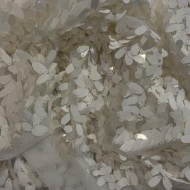 Ткань демонстрирует высокую устойчивость к износу, не дает усадки после стирок. Пайетки сохраняют прочное крепление и нежный сливочный оттенок при бережном обращении. Требует особой осторожности при стирке и глажке для сохранения целостности декоративного покрытия. Перламутровый блеск пайеток сохраняет свою выразительность и мерцающий эффект при правильном уходе.