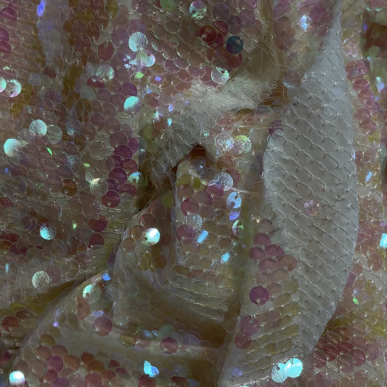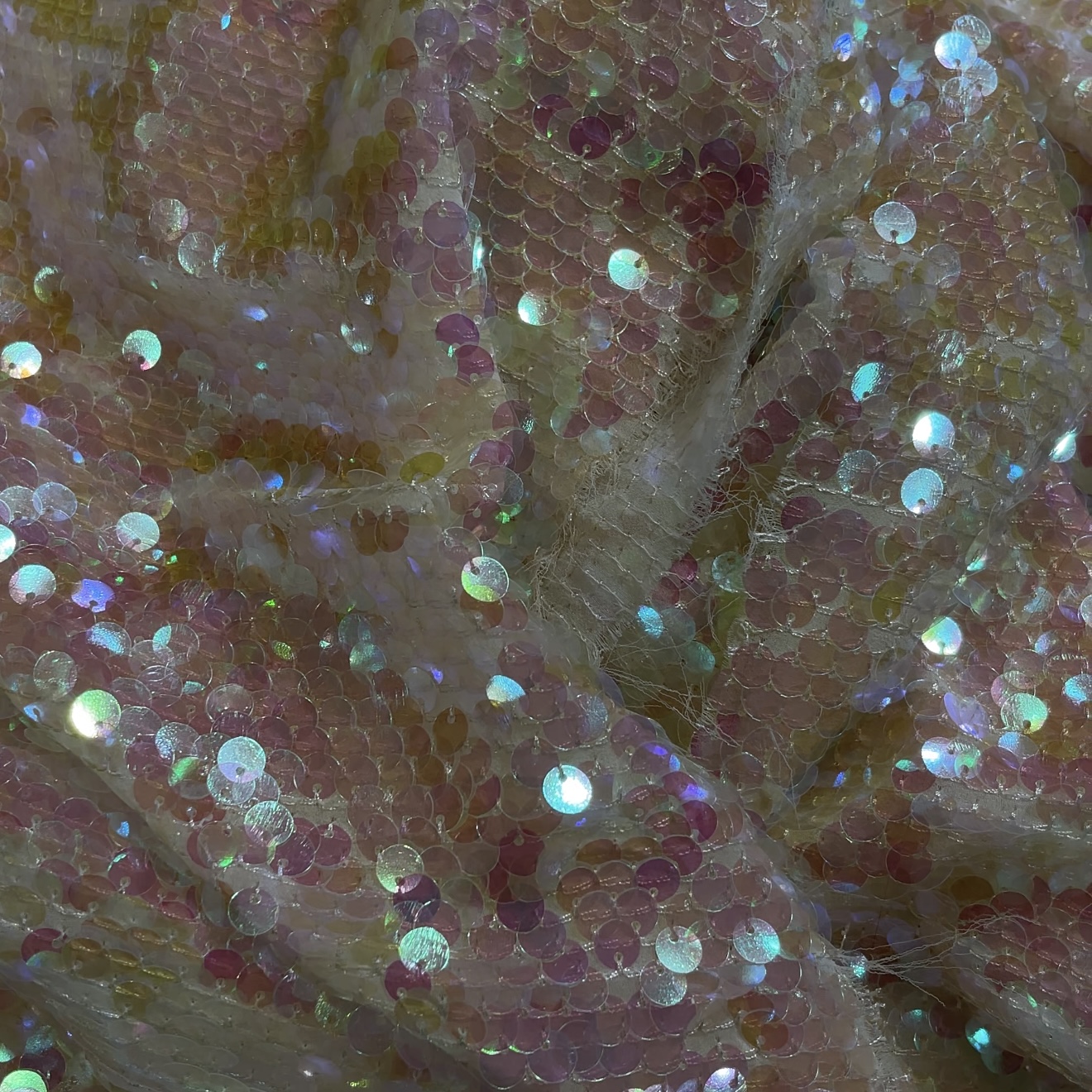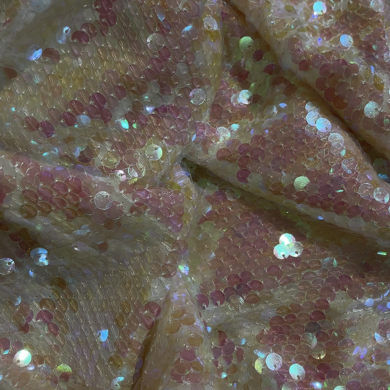 Романтичная итальянская ткань из 100% полиэстера нежного сливочного цвета с изысканным покрытием из пайеток с розовым отливом от бренда Diffusione Tessile. Пайетки равномерно распределены по всей поверхности, создавая нежный мерцающий эффект, который переливается от перламутрового блеска до нежно-розового оттенка в зависимости от угла падения света. Сочетание теплого сливочного фона и розового мерцания пайеток создает утонченный и элегантный визуальный образ. Пайетки надежно закреплены на полиэстеровой основе, что обеспечивает их устойчивость к осыпанию при правильной эксплуатации. Ткань непрозрачная, не требует дополнительной подкладки, хорошо держит форму. Идеально подходит для создания свадебных платьев, вечерних нарядов, праздничных блузок, детских карнавальных костюмов и элегантных аксессуаров для особых мероприятий.