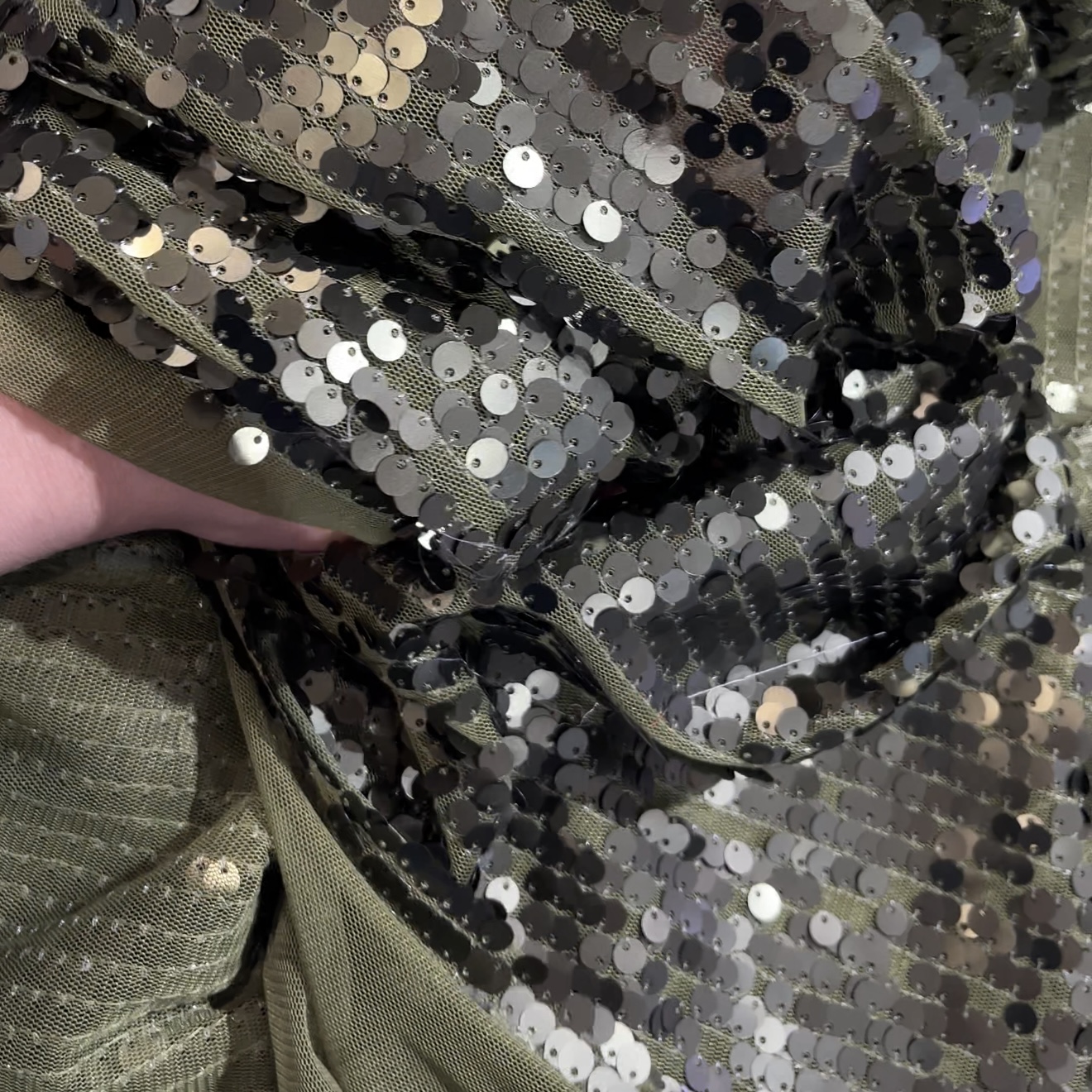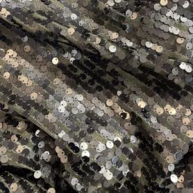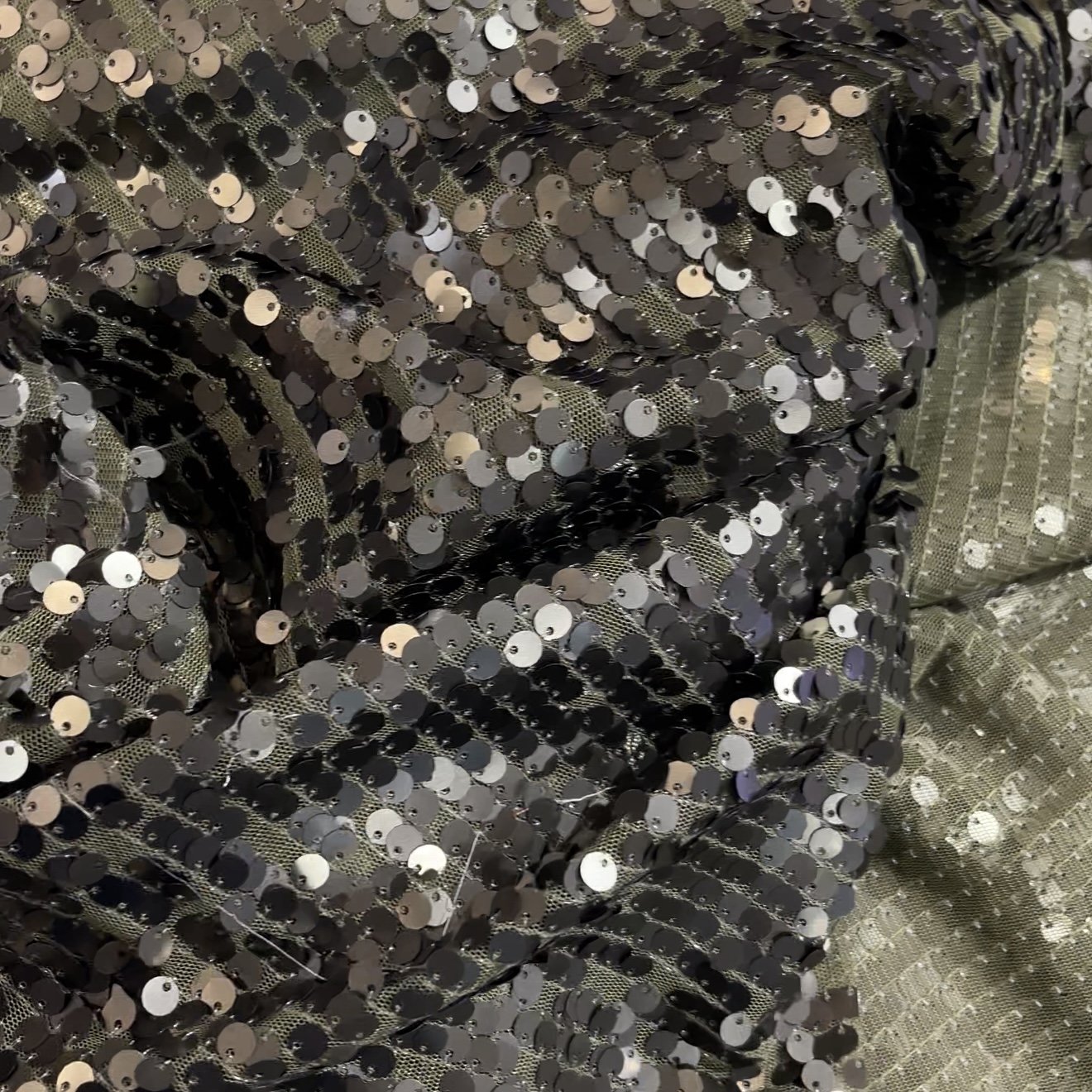 Эффектная итальянская ткань из 100% полиэстера с роскошным покрытием из серых пайеток от бренда Diffusione Tessile. Пайетки равномерно распределены по всей поверхности, создавая мерцающий эффект, который играет разными оттенками серого в зависимости от освещения. Материал отличается высокой прочностью и износостойкостью, пайетки надежно закреплены на полиэстеровой основе, что обеспечивает их устойчивость к осыпанию при правильной эксплуатации. Ткань создает драматический визуальный эффект, переливаясь от светло-серебристого до глубокого графитового оттенка. Материал непрозрачный, не требует дополнительной подкладки, хорошо держит форму. Идеально подходит для создания вечерних платьев, коктейльных нарядов, сценических костюмов, элегантных топов и модных аксессуаров для особых мероприятий.