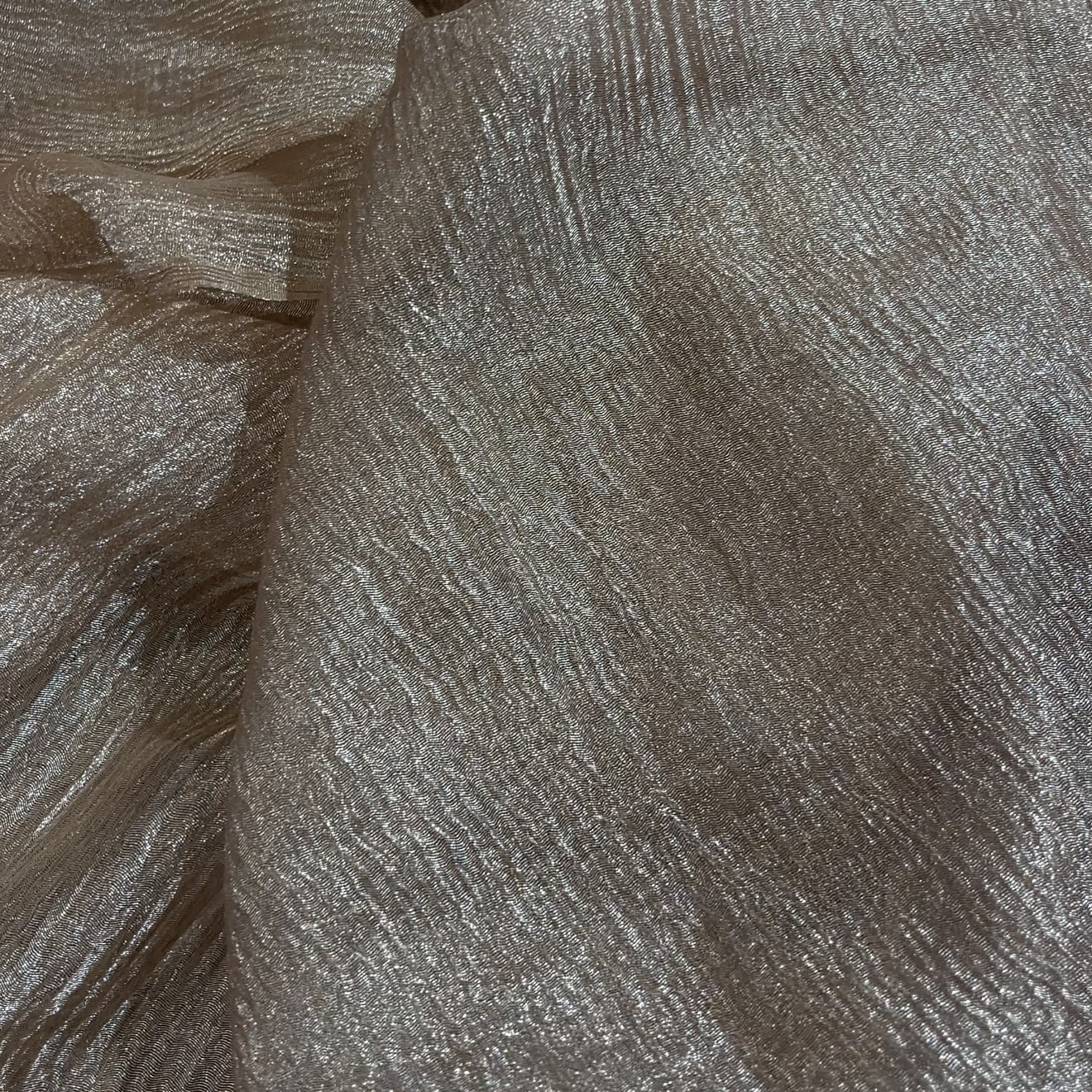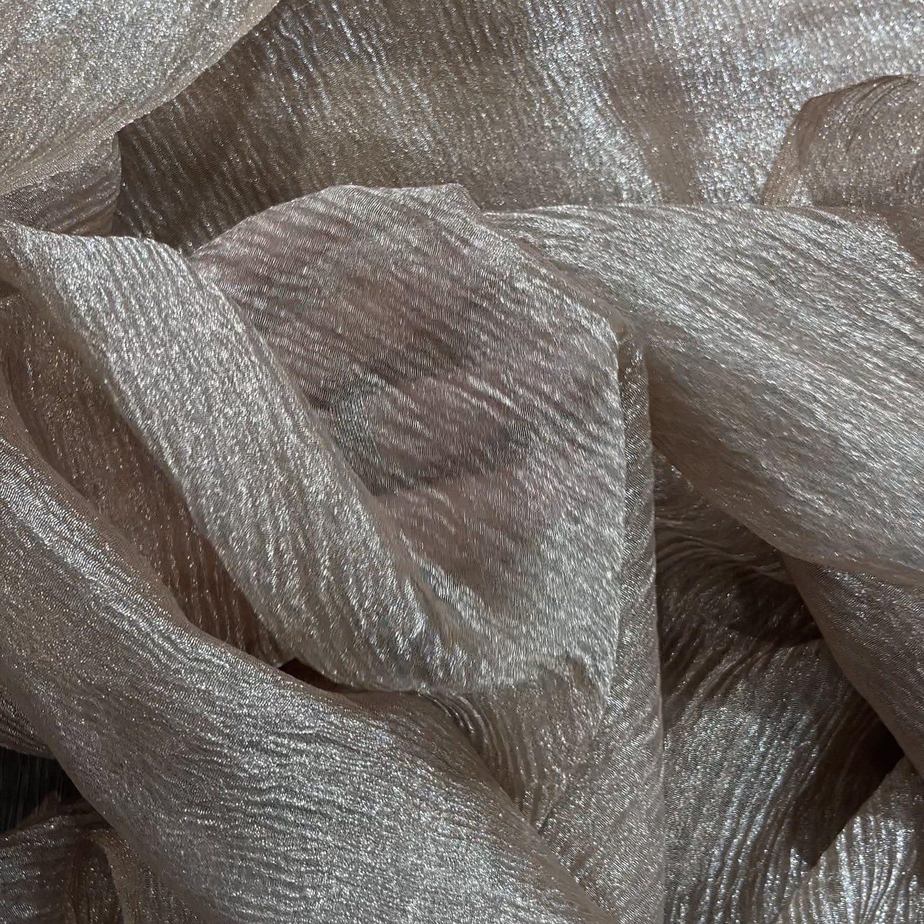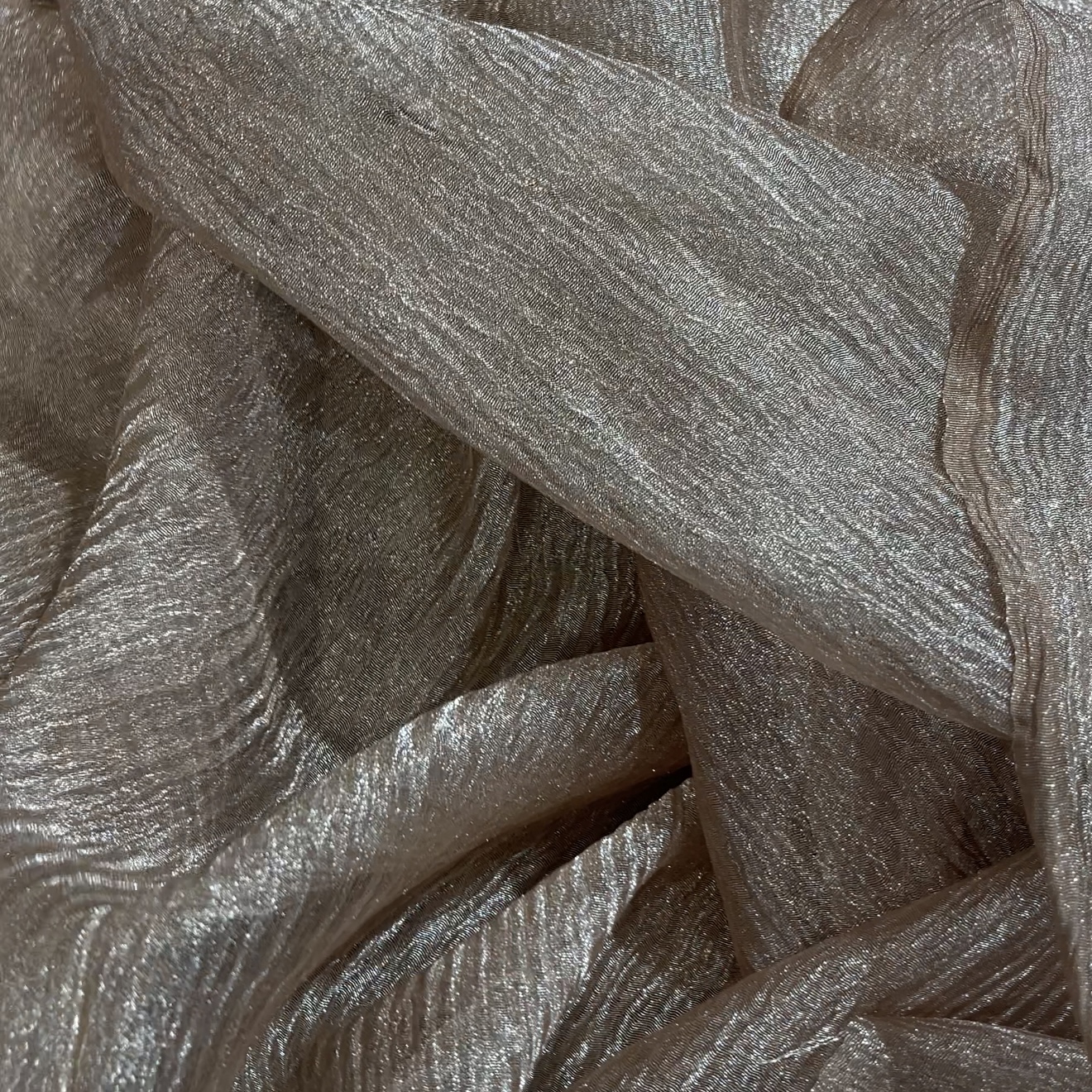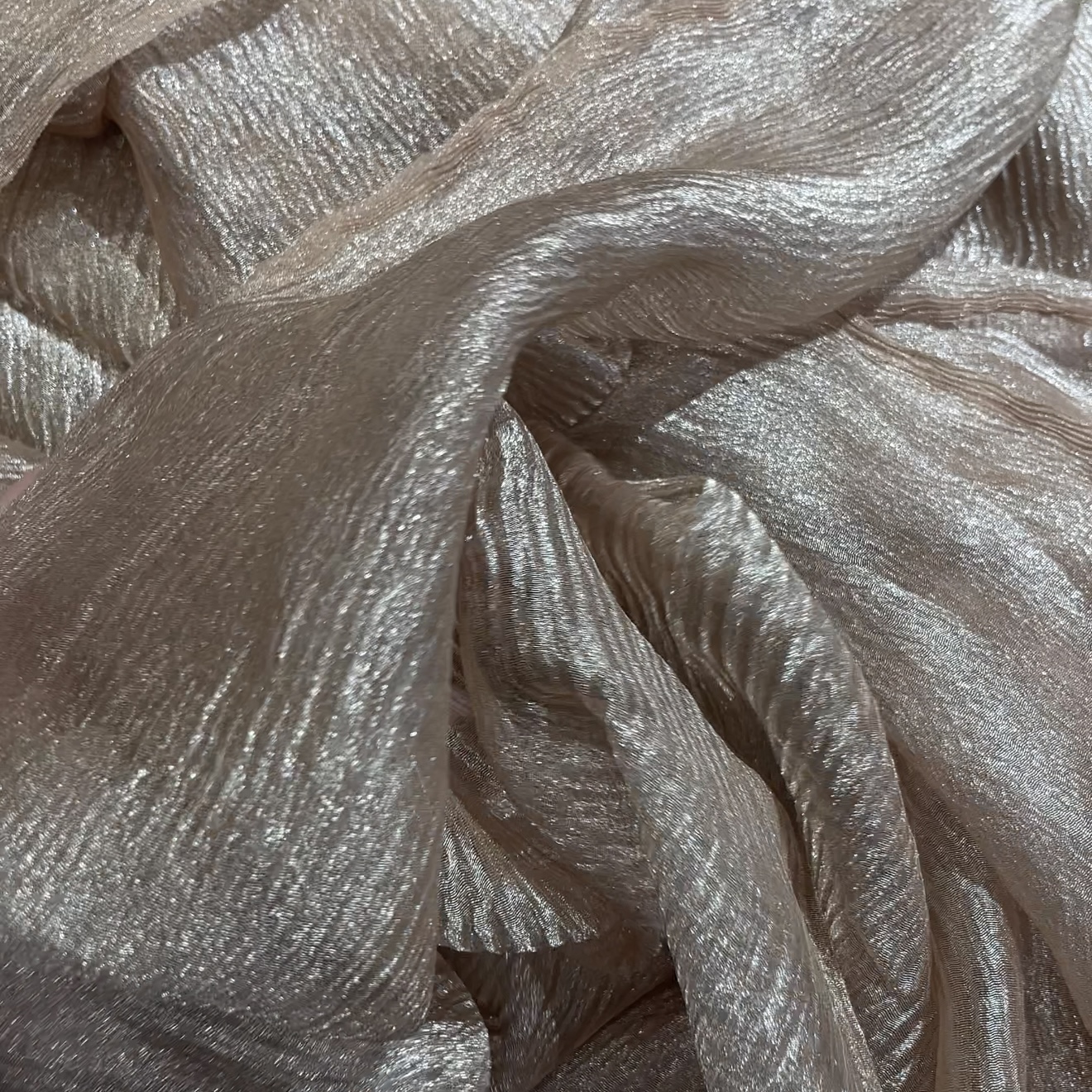Утонченная итальянская ткань из 100% полиэстера нежного сливочного цвета с выразительным жатым эффектом и деликатным блеском от бренда Diffusione Tessile. Креповая фактура с характерными мелкими складками создает объемную текстуру, которая эффектно играет на свету благодаря ненавязчивому мерцанию. Жатый эффект сочетает в себе практичность — ткань практически не мнется в процессе носки — и эстетическую привлекательность, создавая иллюзию легкости и воздушности. Мягкая текстура приятна к телу, превосходно драпируется в изящные складки, подчеркивая романтичность сливочного оттенка. Ткань непрозрачная, не требует дополнительной подкладки. Идеально подходит для пошива свадебных и вечерних платьев, элегантных блузок, юбок, а также для создания стильной детской одежды и декоративных интерьерных аксессуаров.