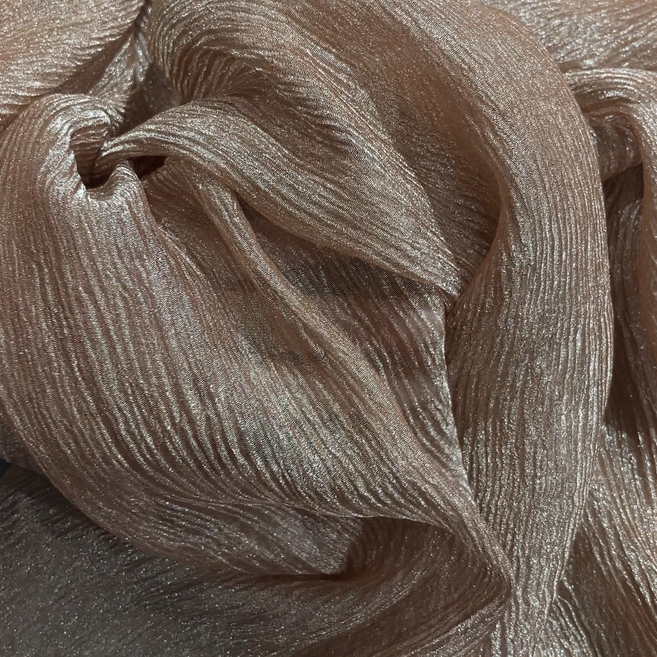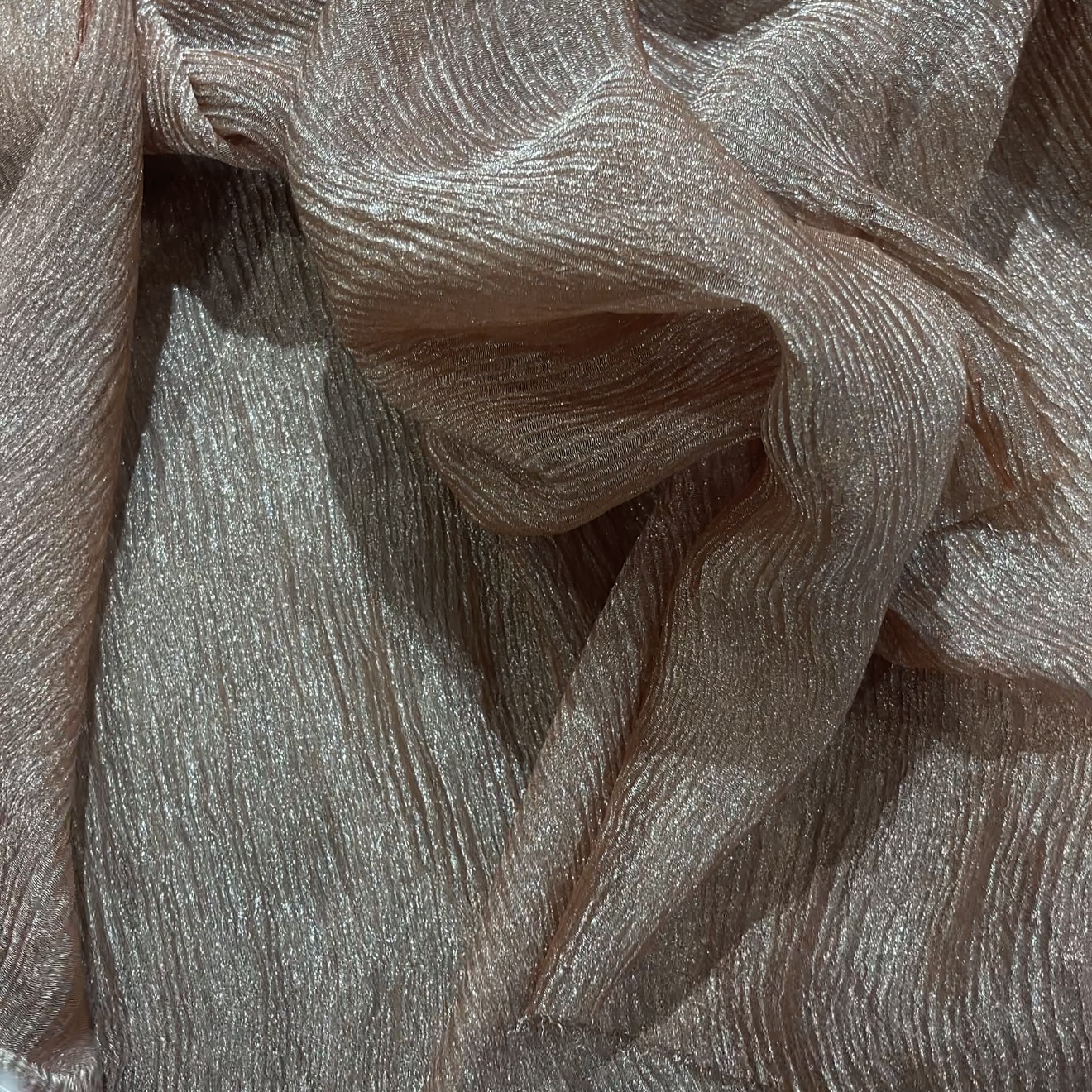 Солнечная итальянская ткань из 100% полиэстера жизнерадостного светло-оранжевого цвета с выразительным жатым эффектом и деликатным блеском от бренда Diffusione Tessile. Креповая фактура с характерными мелкими складками создает объемную текстуру, которая эффектно переливается на свету благодаря ненавязчивому мерцанию поверхности. Жатый эффект сочетает практическую пользу — ткань практически не мнется в процессе носки — с визуальной привлекательностью, создавая ощущение легкости и динамики. Теплый оранжевый оттенок излучает оптимизм и энергию, идеально подходя для создания ярких образов. Мягкая текстура приятна к телу, превосходно драпируется в живописные складки. Ткань непрозрачная, не требует дополнительной подкладки. Идеально подходит для пошива летних платьев, юбок, блузок, детской одежды, а также для создания стильных аксессуаров и декоративных элементов интерьера.