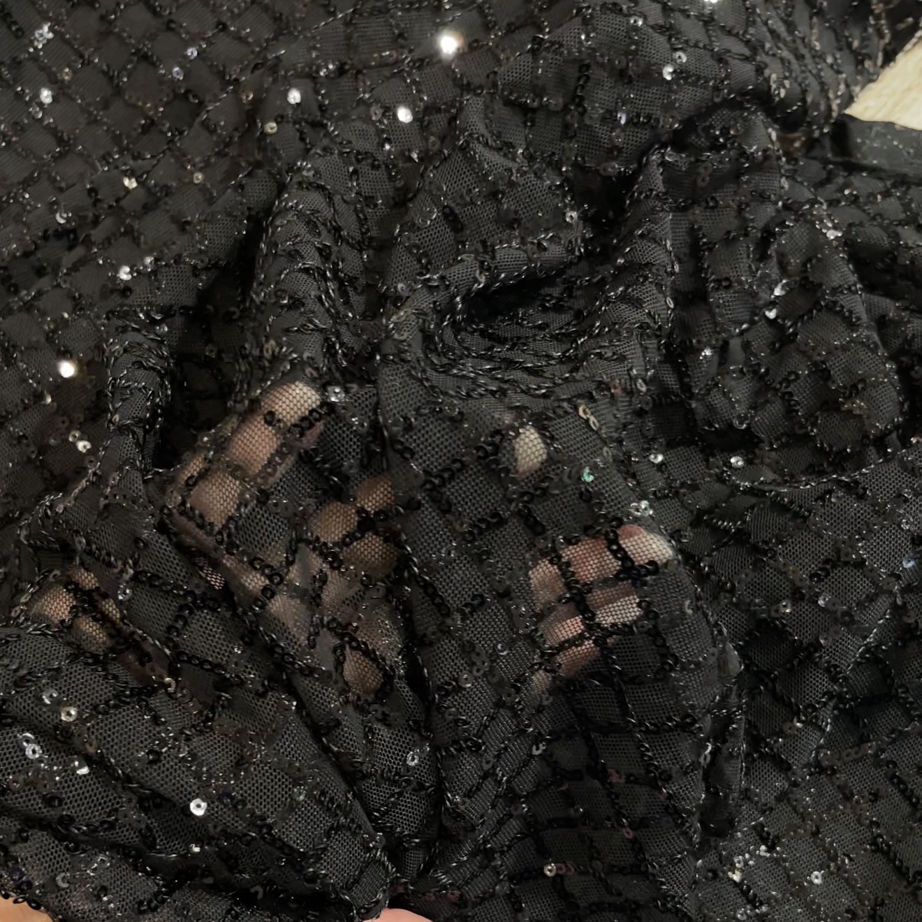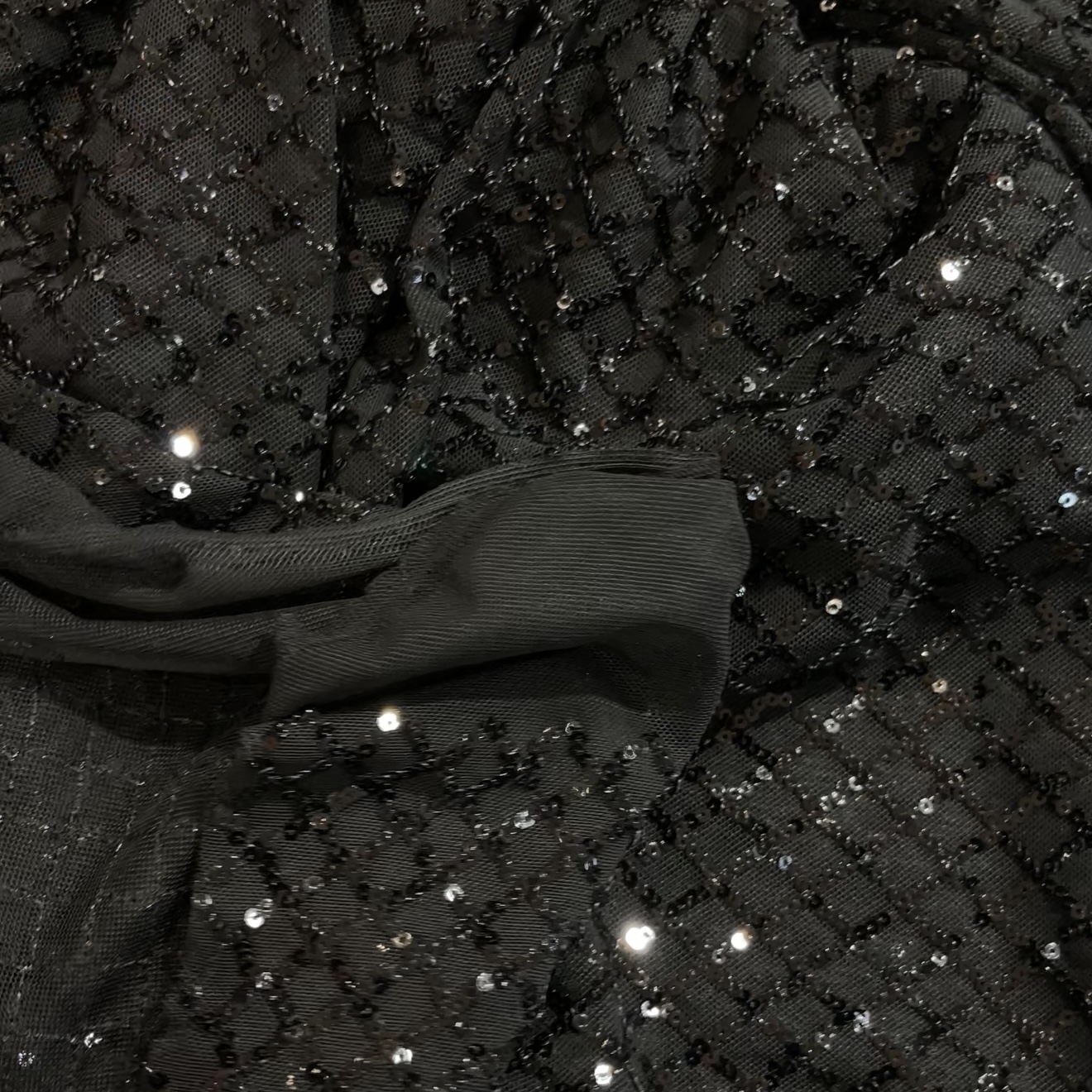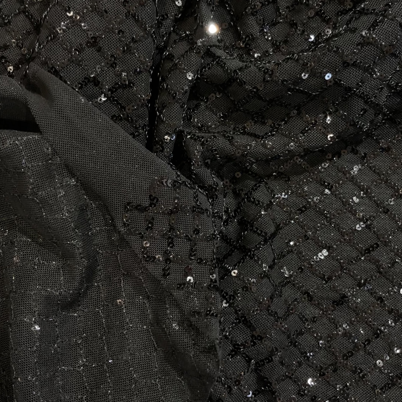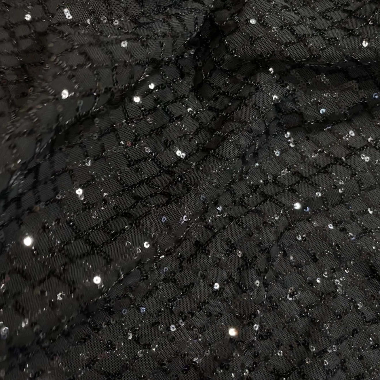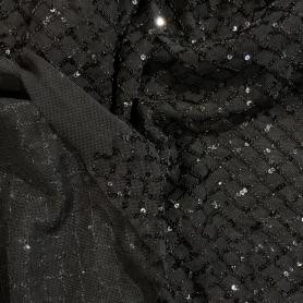 Эффектная итальянская ткань из 100% полиэстера глубокого черного цвета с роскошным абстрактным узором из пайеток от бренда Diffusione Tessile. Материал создает драматический визуальный эффект благодаря контрасту матовой черной основы и мерцающих пайеток, образующих замысловатый абстрактный рисунок. Пайетки надежно закреплены на ткани, обеспечивая долговечность и устойчивость к осыпанию при правильном уходе. Ткань отличается высокой прочностью, хорошо держит форму, не мнется и сохраняет презентабельный вид throughout вечера. Материал непрозрачный, не требует дополнительной подкладки. Идеально подходит для создания вечерних платьев, коктейльных нарядов, сценических костюмов, элегантных блузок и модных аксессуаров для особых случаев.