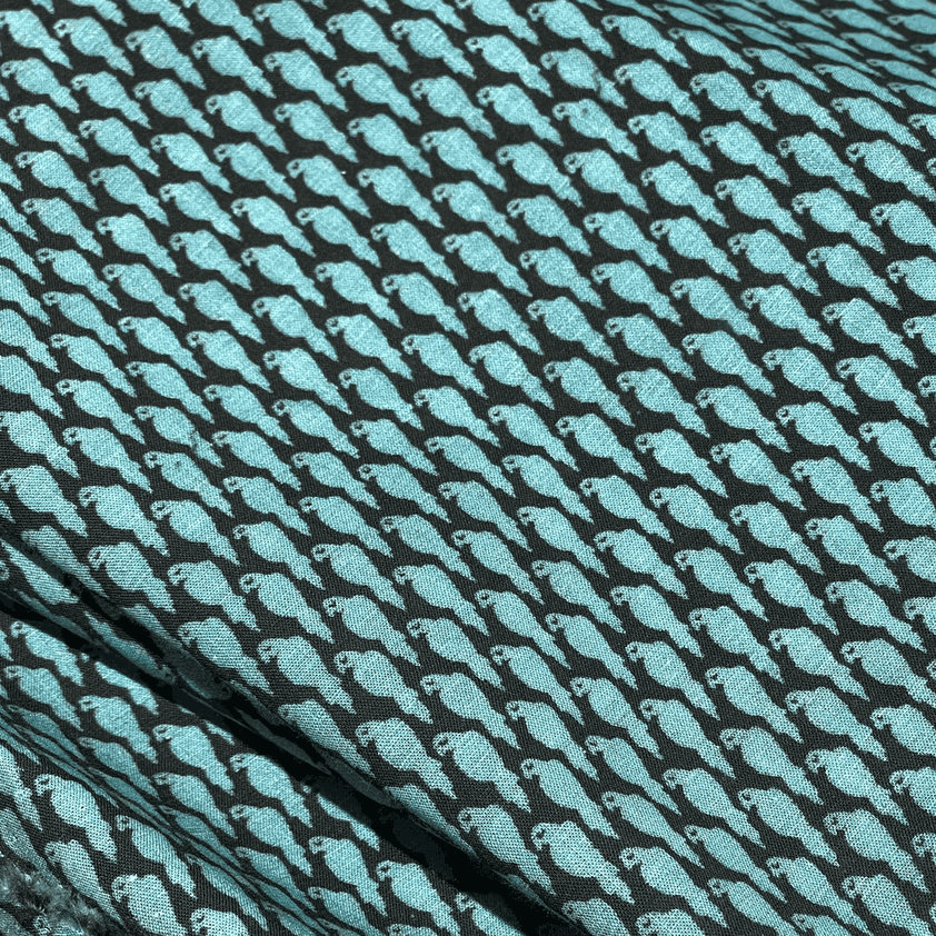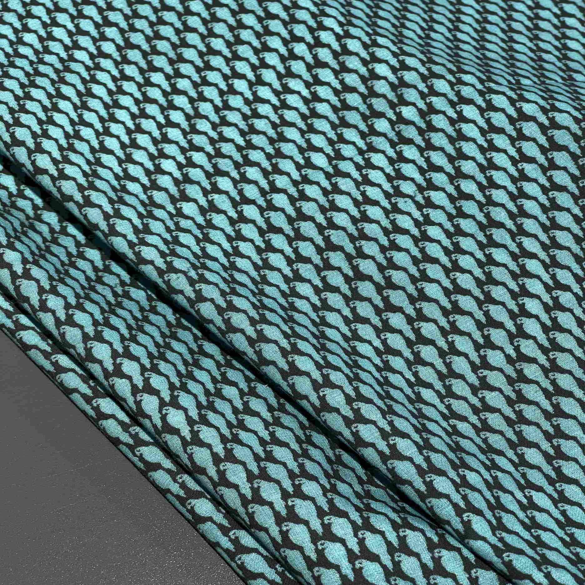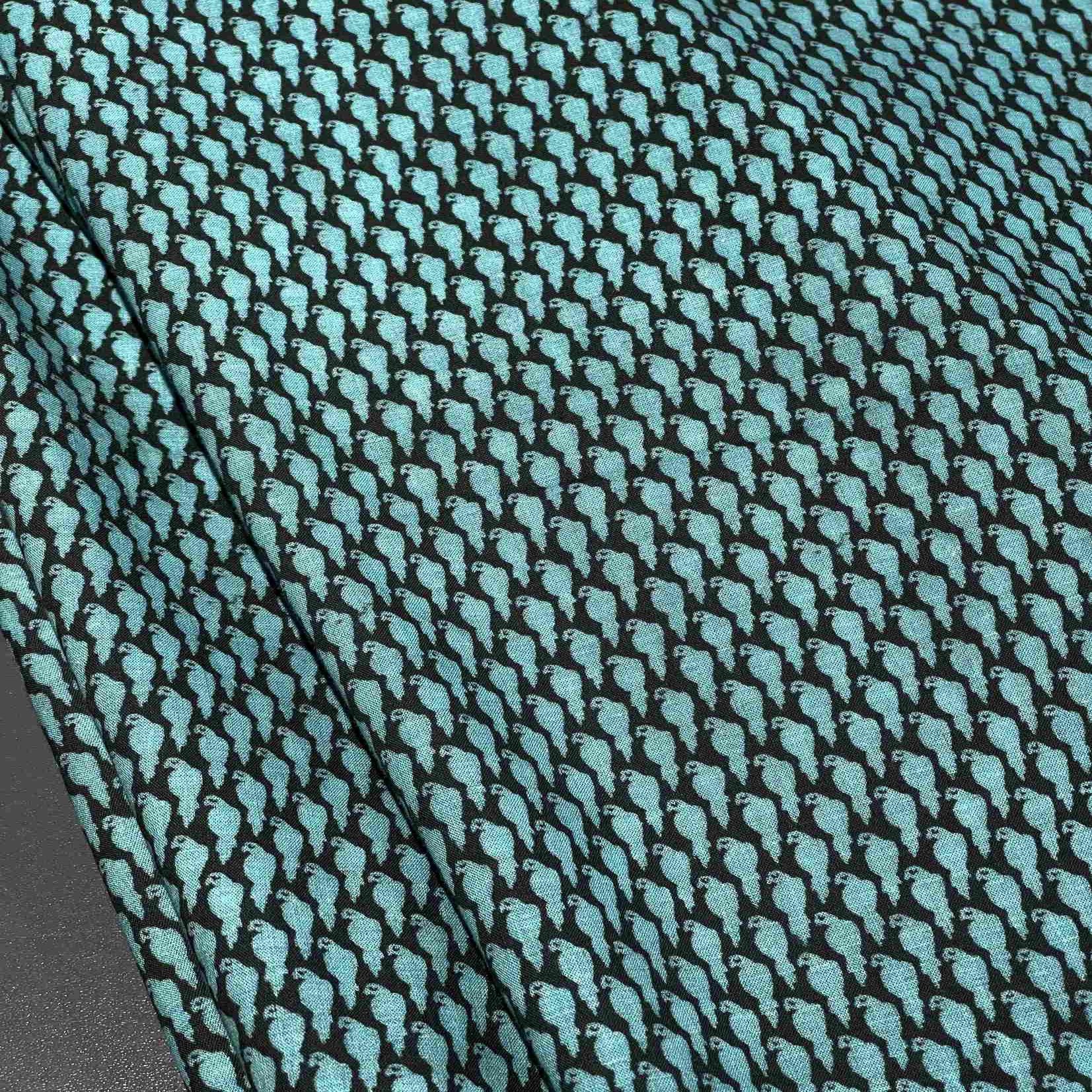 Ткань может дать усадку 3-5% после первой стирки. При правильном уходе демонстрирует отличную стойкость черного цвета и яркость бирюзового принта.
