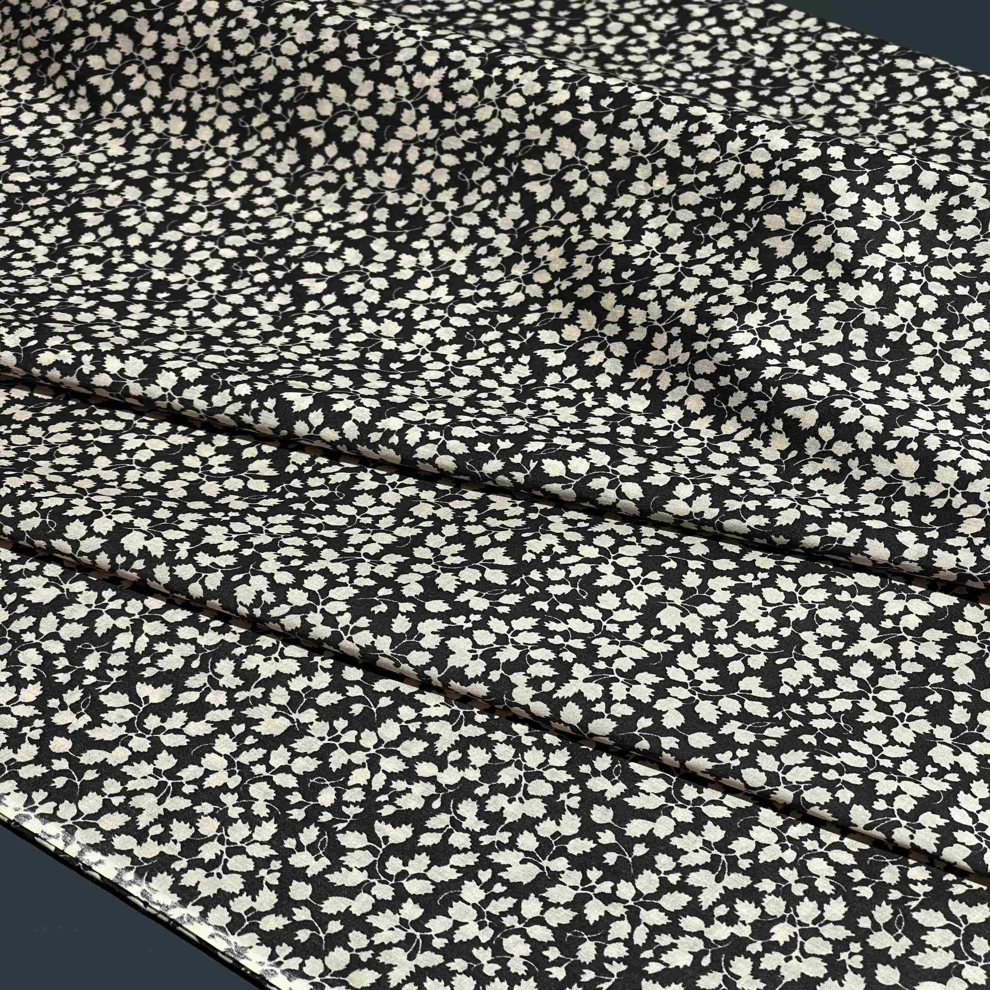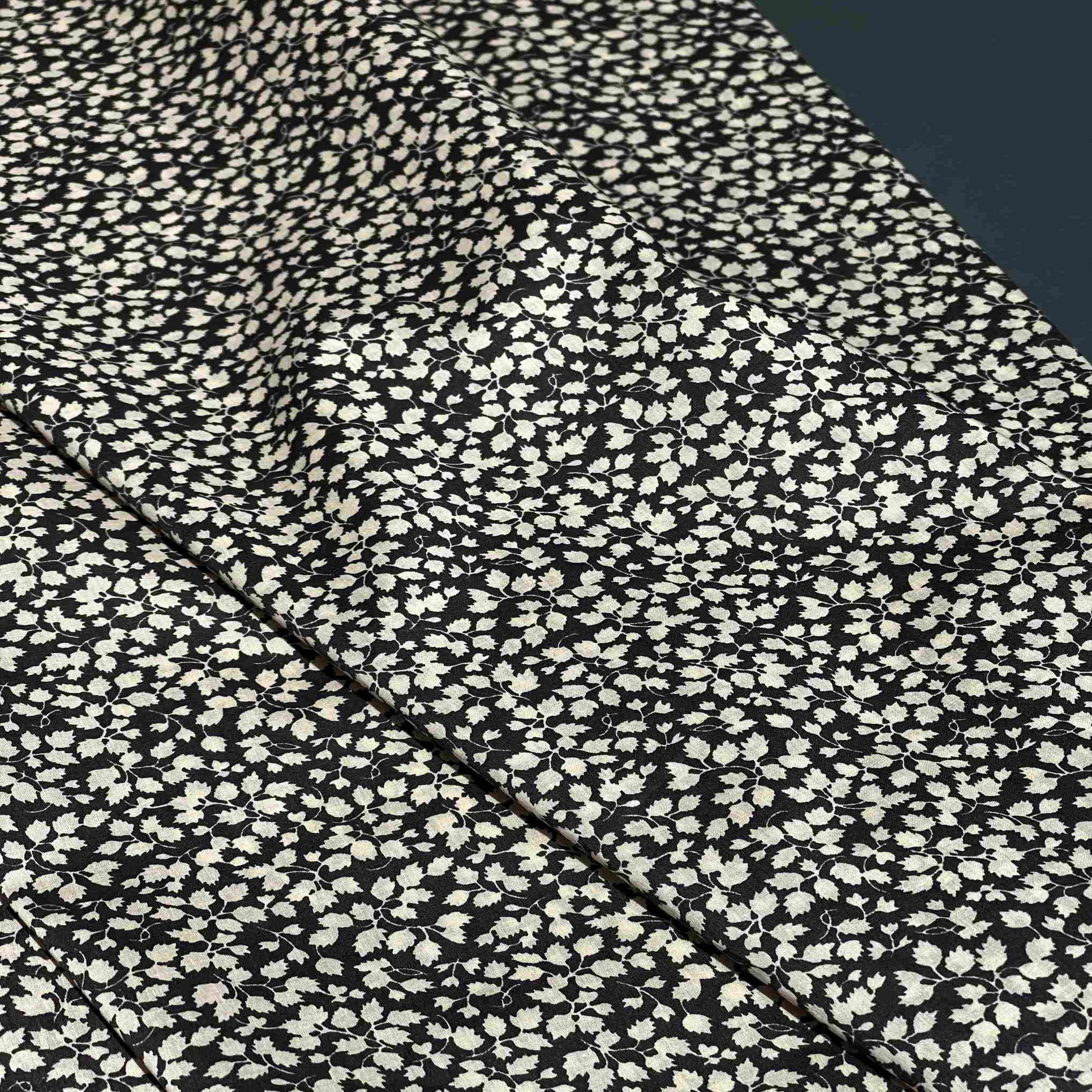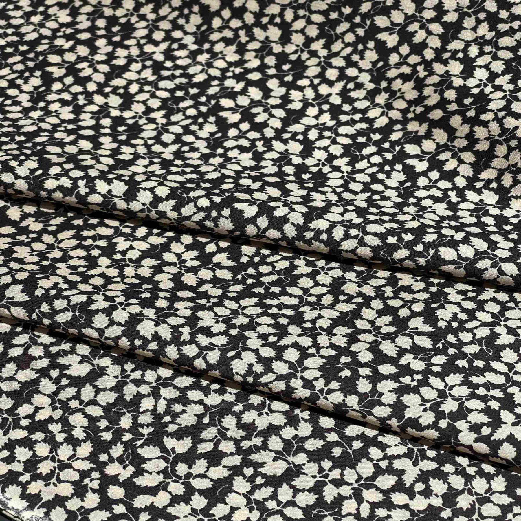 Итальянский хлопок черного цвета с нежным принтом, на котором густо расположены мелкие белые и кремовые цветы с листочками (артикул 178489) — это изысканная и загадочная ткань для создания элегантных, романтичных и запоминающихся образов. Материал обладает натуральной матовой фактурой, приятной на ощупь и гипоаллергенной. Мелкий цветочный рисунок в светлых тонах на глубоком черном фоне создает эффект звездного неба или заснеженного сада, добавляя ткани загадочности, изящества и вневременной элегантности. Густое расположение цветов придает ткани особую выразительность и текстурную насыщенность. Этот хлопок идеально подходит для повседневной и вечерней одежды, аксессуаров и предметов интерьера в стилях романтика, бохо, гранж, минимализм или вечерняя классика. Хлопок обладает высокой воздухопроницаемостью и гигроскопичностью, обеспечивая комфорт в носке. Ткань подходит для пошива платьев, блузок, юбок, топов и аксессуаров. Она устойчива к пиллингу, что сохраняет четкость и выразительность нежного принта. Плотность материала делает его непрозрачным.