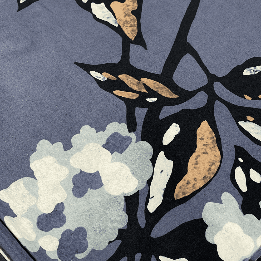 Ткань может дать усадку 3-5% после первой стирки. При правильном уходе демонстрирует отличную стойкость насыщенного фиолетового цвета и четкость цветочного рисунка.