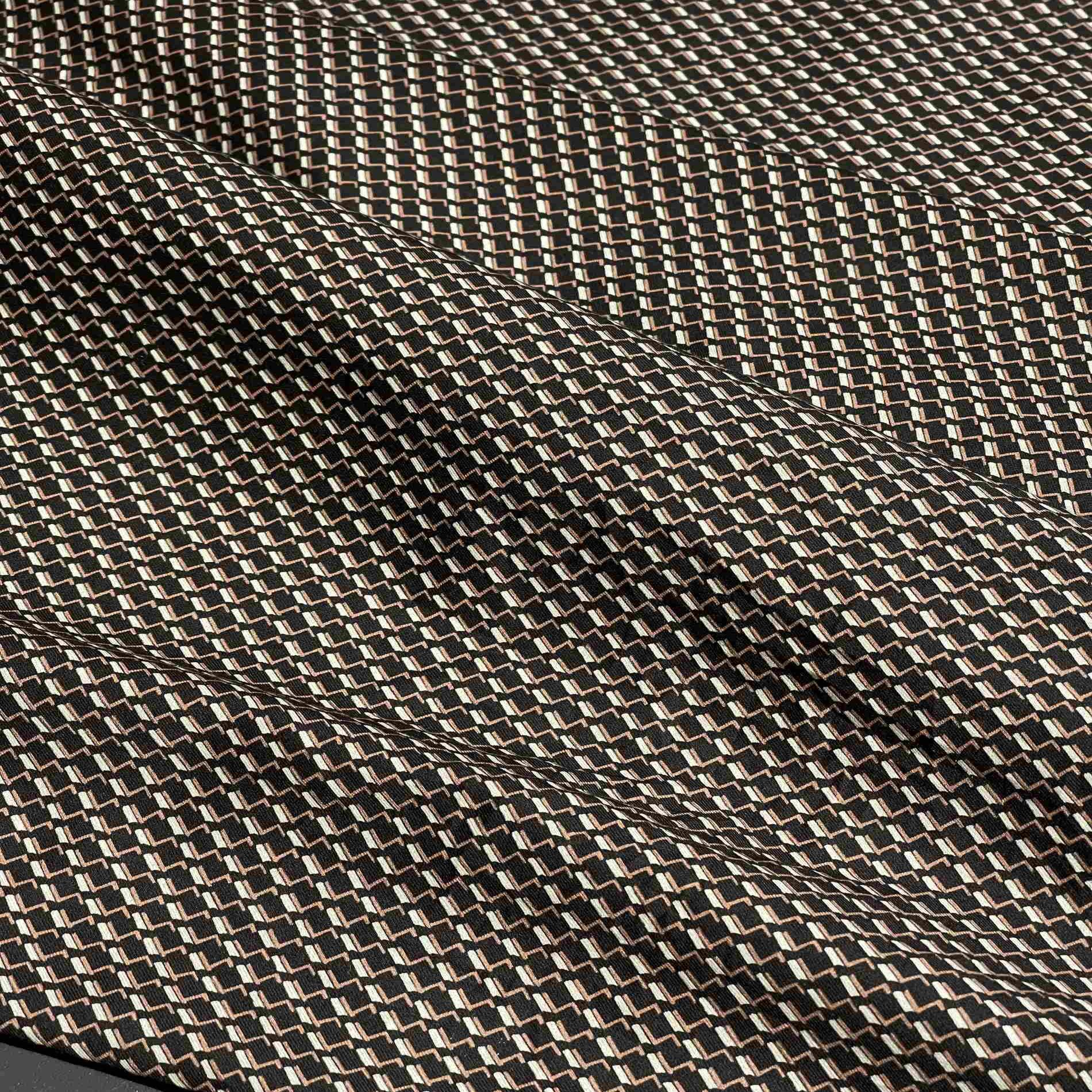 Итальянский хлопок коричневого цвета с современным геометрическим принтом (артикул 187405-5) — это стильная и лаконичная ткань для создания динамичных, структурированных и актуальных образов. Материал обладает натуральной матовой фактурой, приятной на ощупь и гипоаллергенной. Четкий геометрический рисунок (ромбы, квадраты, линии или абстрактные формы) в контрастных или тональных цветах на насыщенном коричневом фоне добавляет ткани графичности, глубины и современной эстетики, делая ее идеальным выбором для повседневной, офисной и спортивной одежды в стилях минимализм, арт-деко, стритвир или smart casual. Хлопок обладает высокой воздухопроницаемостью и гигроскопичностью, обеспечивая комфорт в носке. Ткань подходит для пошива платьев, рубашек, блузок, юбок, брюк и аксессуаров. Она устойчива к пиллингу, что сохраняет четкость и выразительность геометрического принта. Плотность материала делает его непрозрачным.