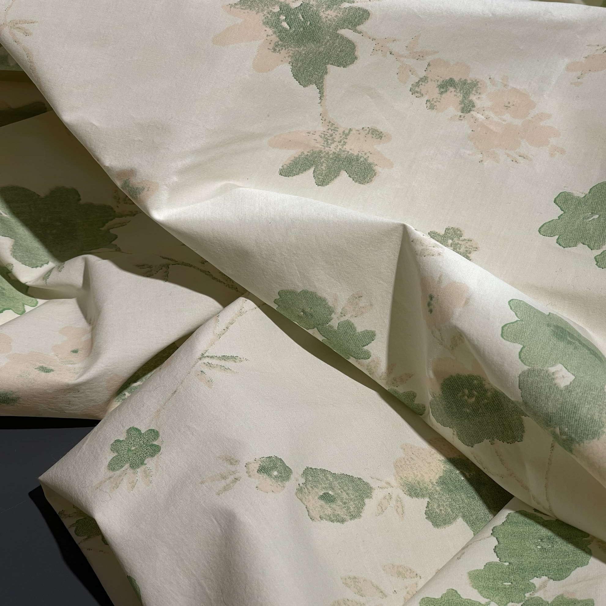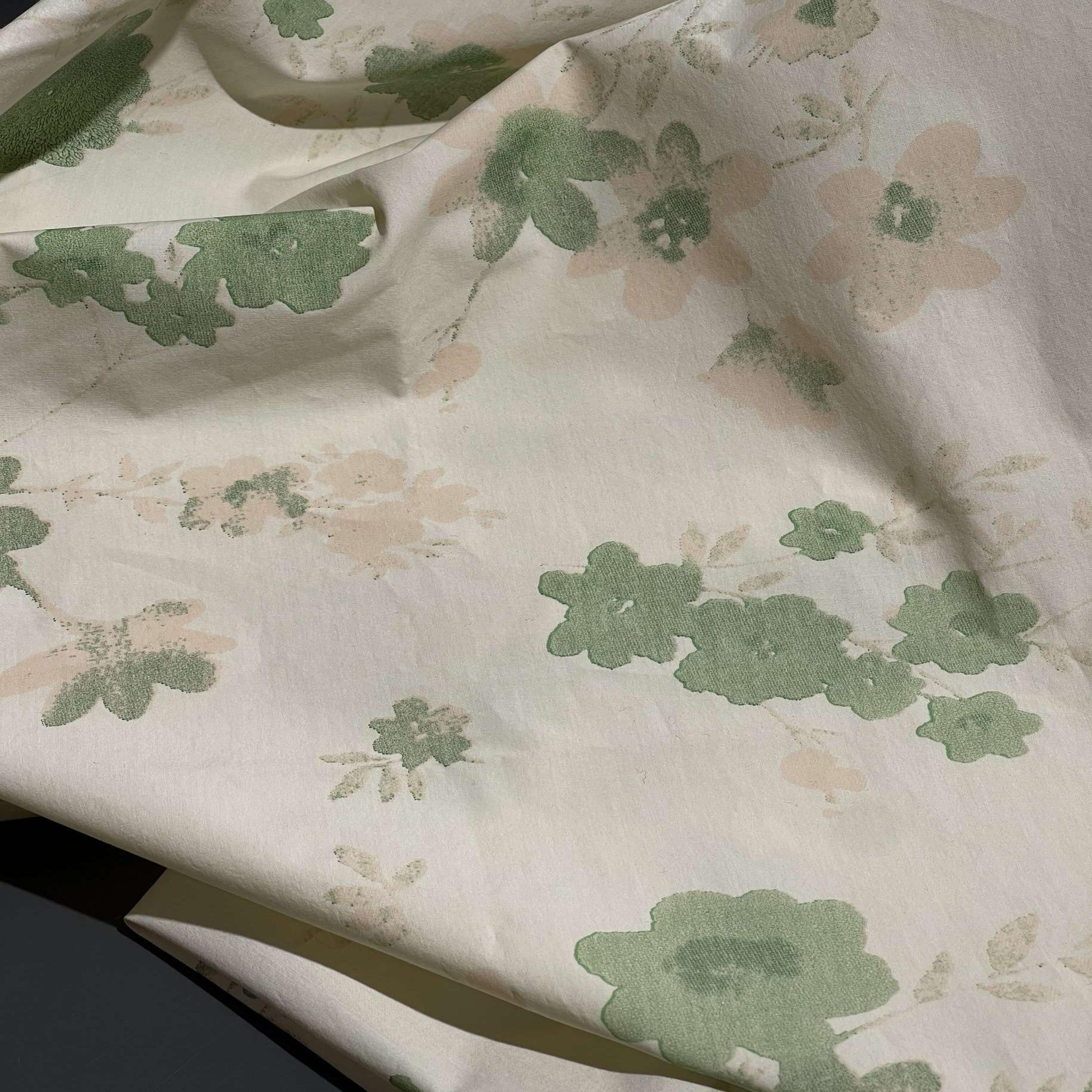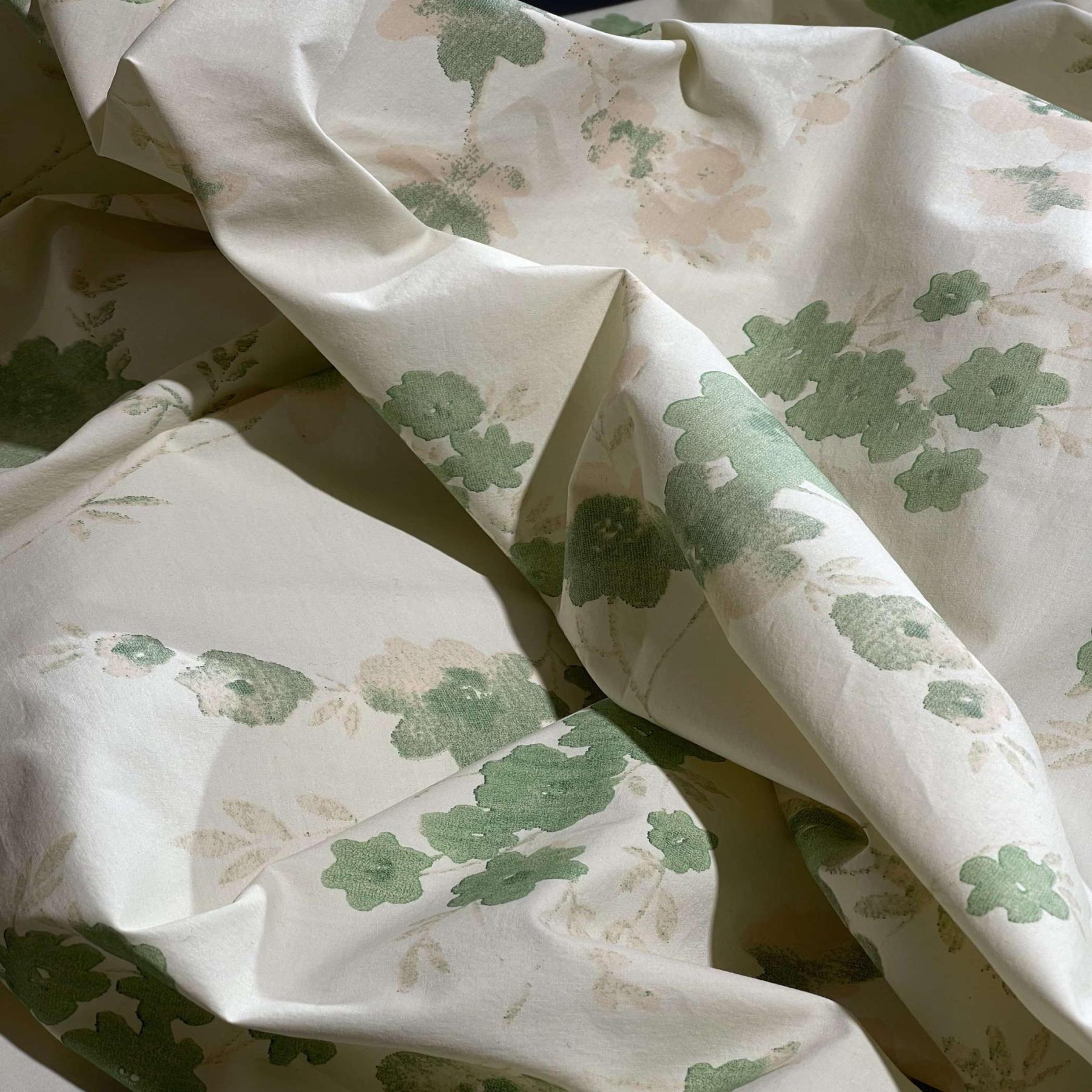 Для сохранения нежности кремового оттенка и яркости цветочного принта стирайте при температуре до 30°C в деликатном режиме с использованием мягких моющих средств для цветных тканей. Первую стирку рекомендуется провести отдельно. Избегайте отбеливателей. Гладьте утюгом с режимом «Хлопок» (средняя температура) с изнаночной стороны.