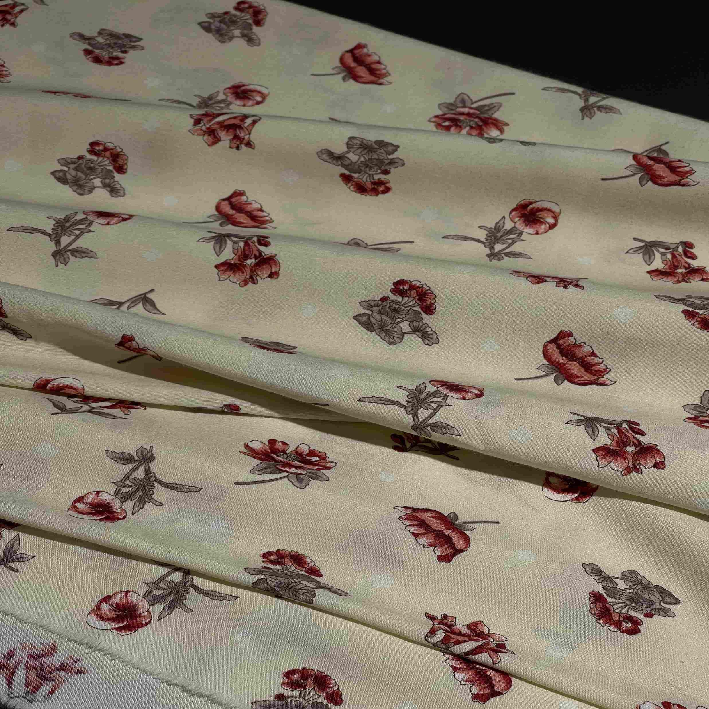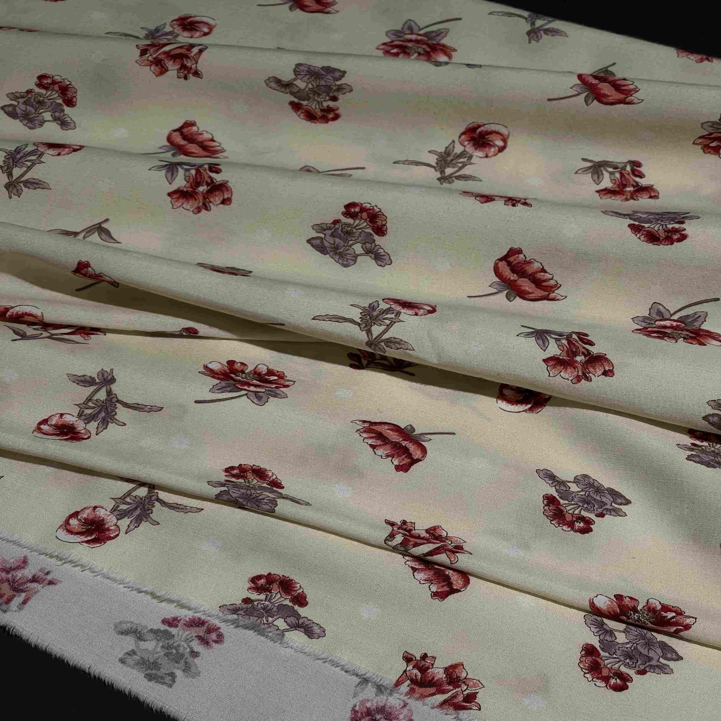 Ткань может дать усадку 3-5% после первой стирки. При правильном уходе демонстрирует отличную стойкость цвета и четкость цветочного рисунка.
