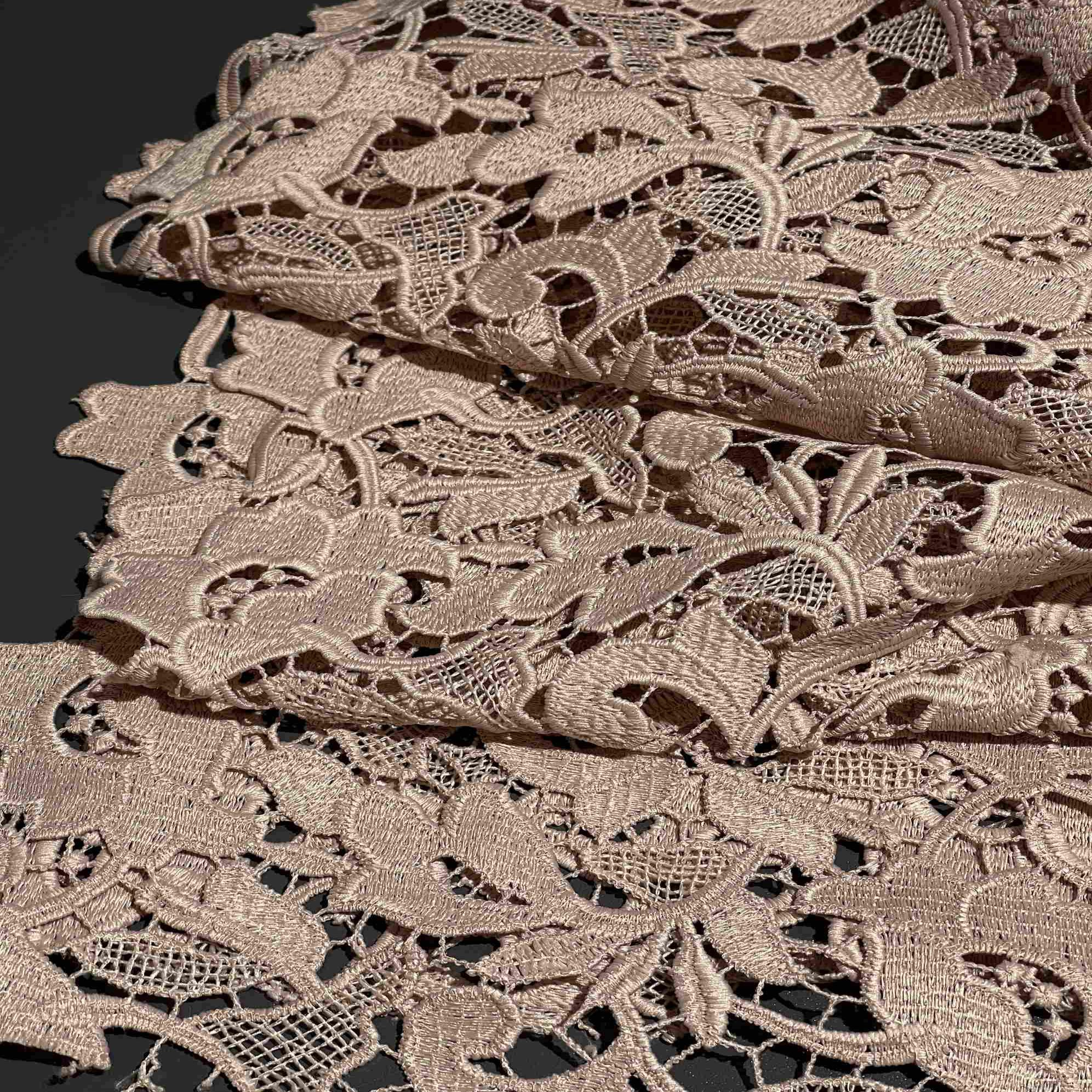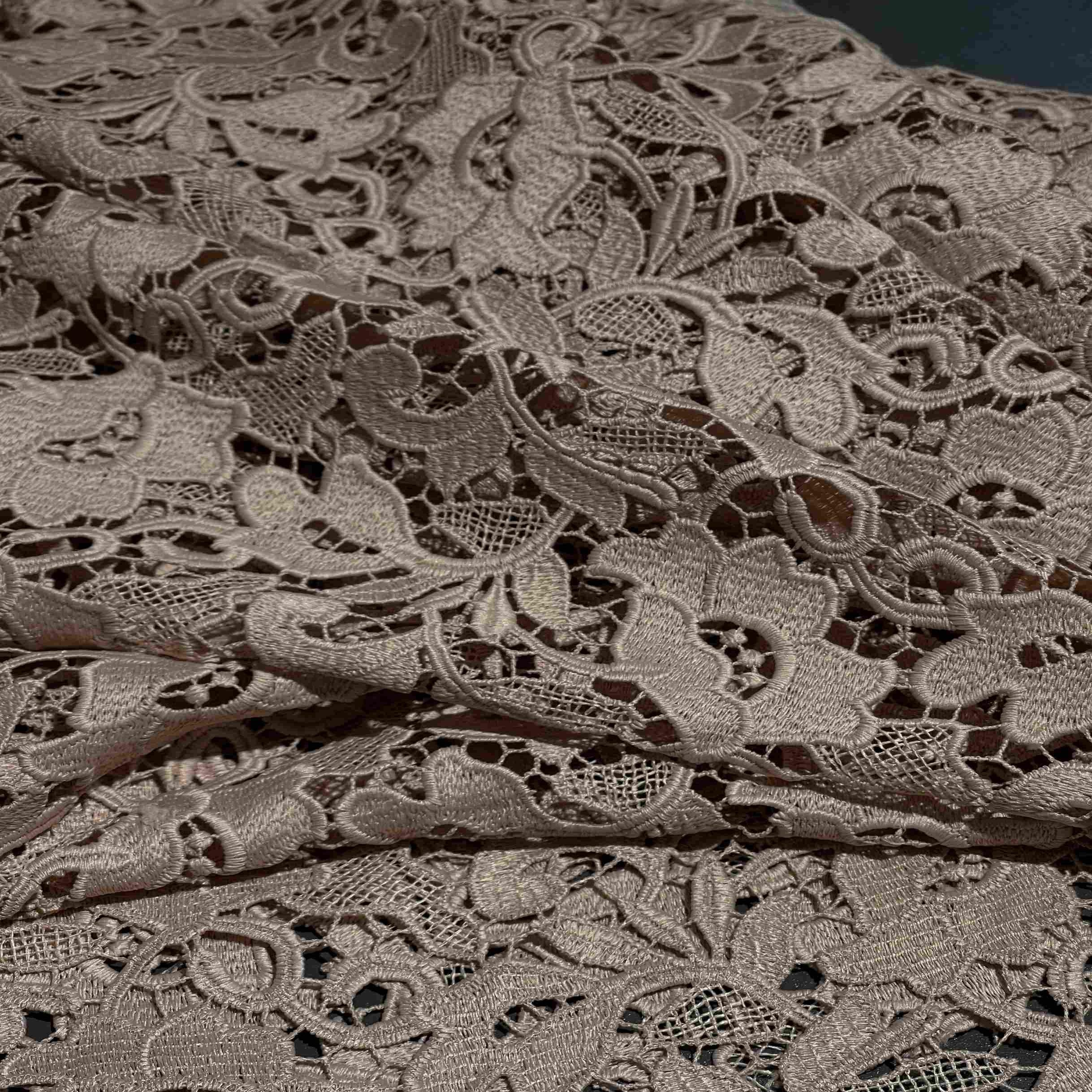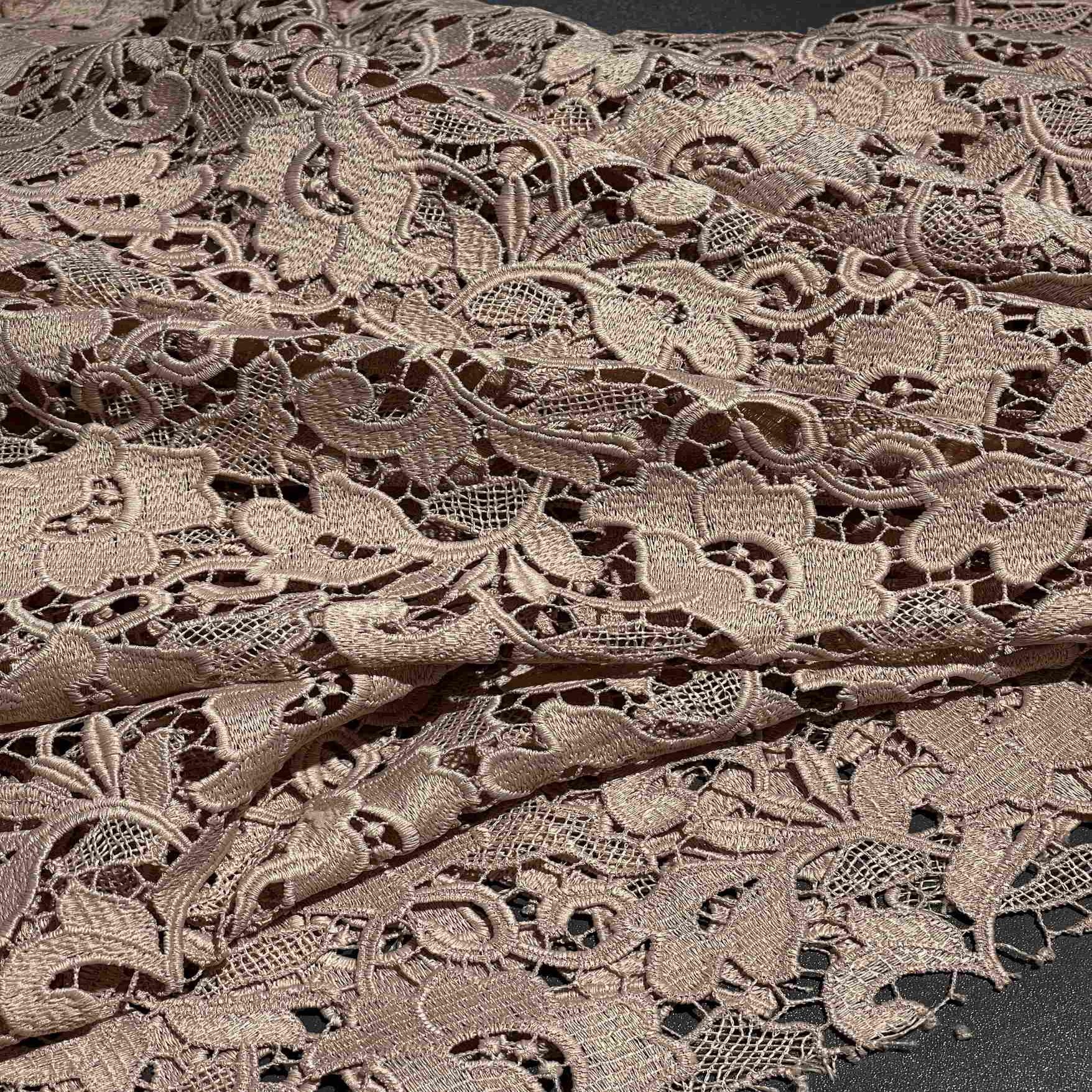 Итальянский полиэстер нежного бежевого цвета в изысканном кружевном исполнении (артикул 150235) — это воплощение утонченной женственности и сдержанной элегантности. Теплый, благородный бежевый оттенок придает ажурному кружеву мягкость и универсальность, позволяя создавать как романтичные, так и повседневные образы. Синтетический состав обеспечивает формоустойчивость, эластичность и износостойкость, позволяя кружеву хорошо драпироваться и сохранять изящный рисунок. Материал идеально подходит для пошива блузок, платьев, топов, белья, а также для декоративных элементов и отделки в стиле романтика и бохо.