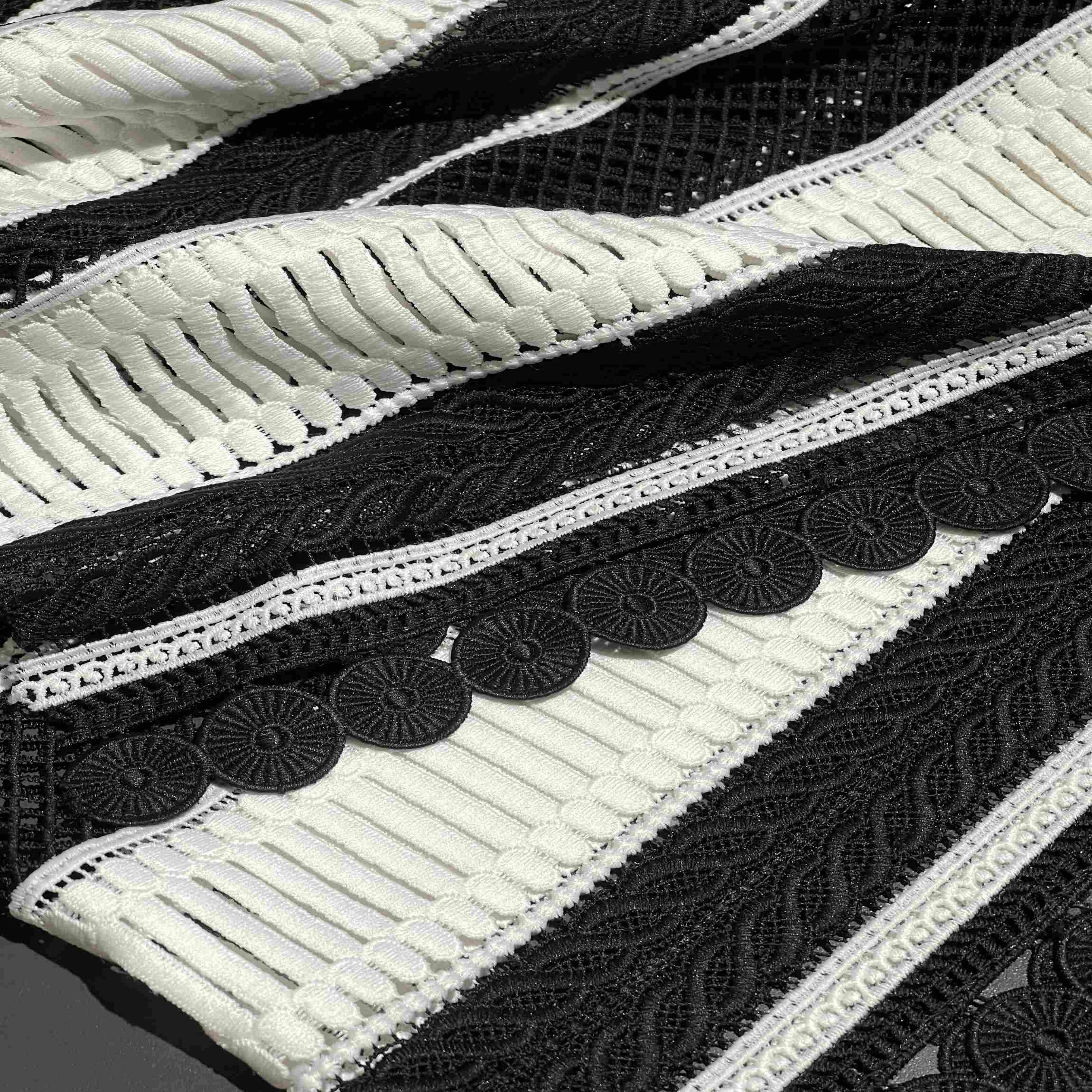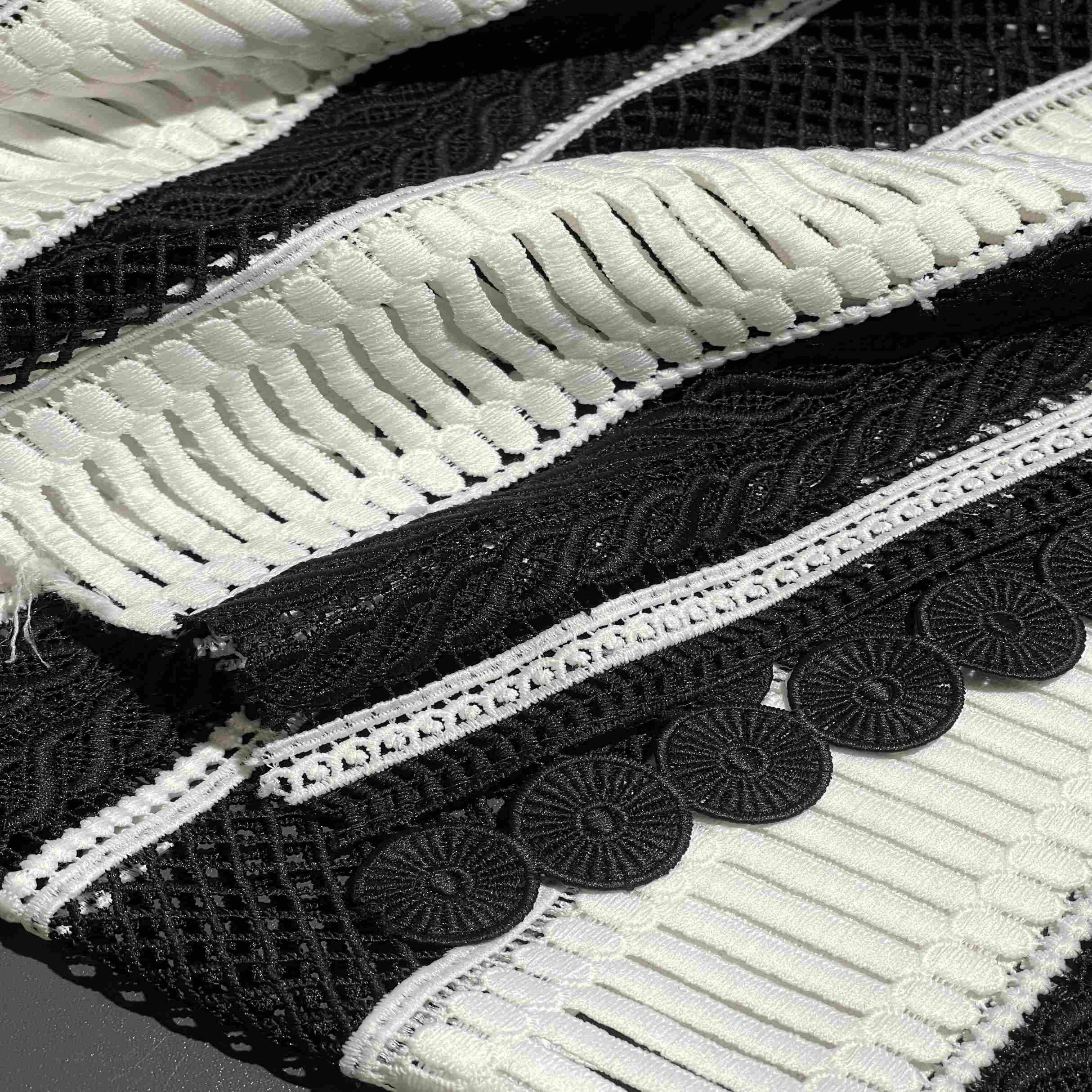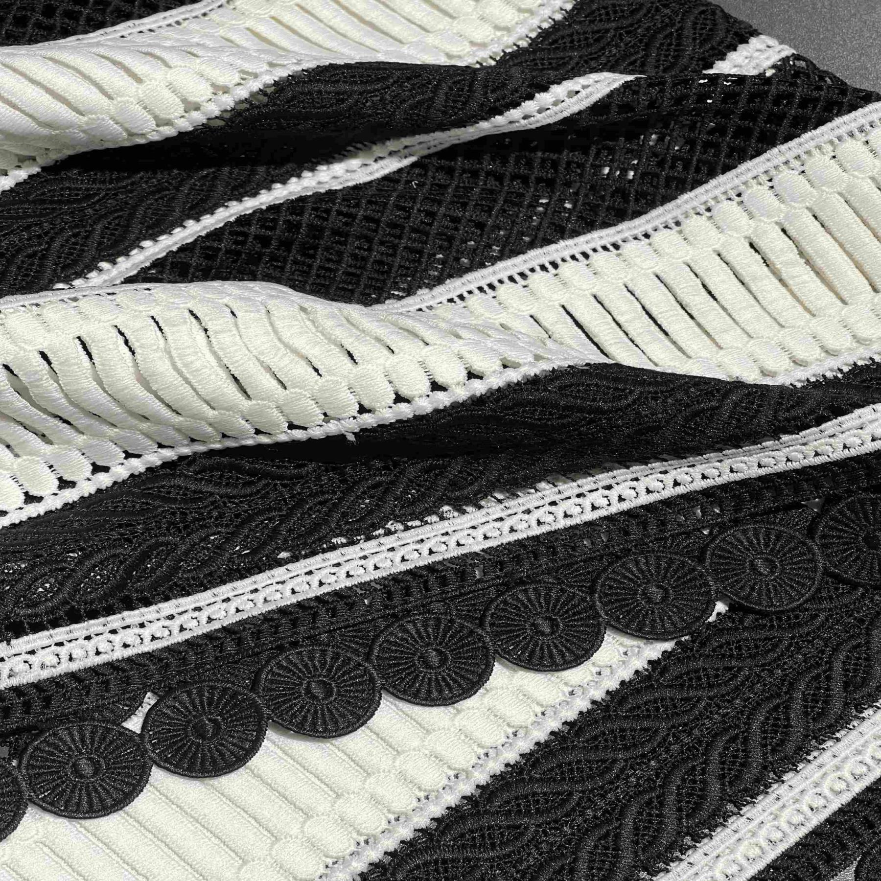 Итальянский полиэстер в графичном черно-белом цвете в изысканном кружевном исполнении (артикул 103916-2) — это воплощение контрастной элегантности и драматического стиля. Сочетание благородного черного и чистого белого в ажурном узоре создает выразительный, запоминающийся дизайн, который приковывает внимание и добавляет образу особую выразительность. Синтетический состав обеспечивает формоустойчивость, эластичность и износостойкость, позволяя кружеву хорошо драпироваться и сохранять изящный рисунок. Материал идеально подходит для пошива вечерних и коктейльных платьев, блузок, топов, а также для декоративных элементов и отделки в стиле модерн, винтаж и подиумной моды.