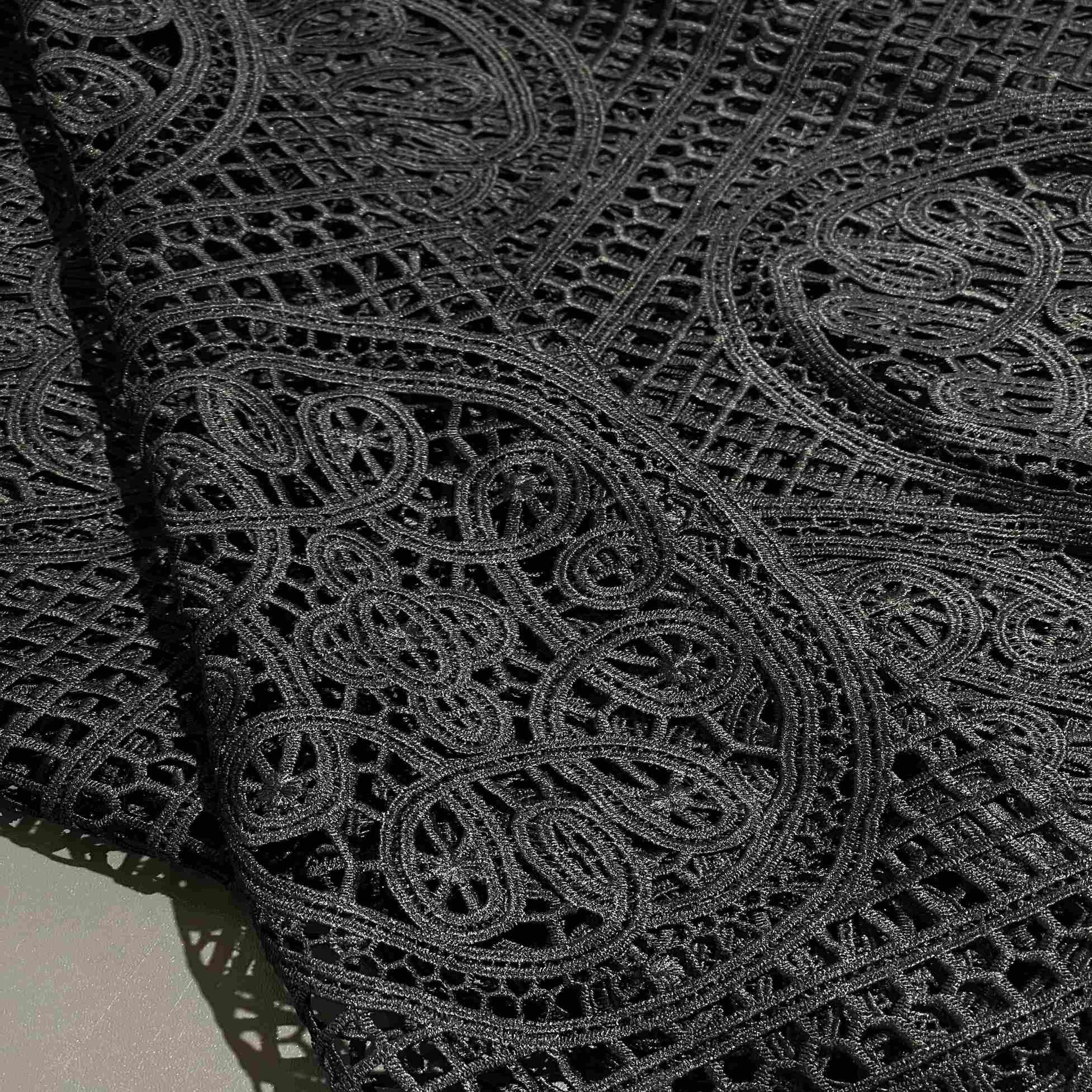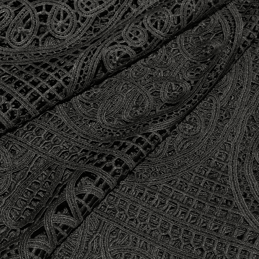 Итальянский полиэстер черного цвета с изысканным кружевным узором (артикул 184011) — это элегантная и практичная ткань для создания женственных, романтичных и эффектных образов. Материал имитирует нежное кружево, при этом обладает всеми преимуществами полиэстера: прочностью, износостойкостью, минимальной сминаемостью и способностью отлично держать форму. Изящный ажурный рисунок на глубоком черном фоне добавляет ткани утонченности, загадочности и соблазнительности, делая ее идеальным выбором для вечерних нарядов, блузок, топов, платьев, нижнего белья и декоративных элементов одежды в стилях романтика, гранж или вечерняя мода. Ткань обладает средней воздухопроницаемостью и хорошо драпируется. Она устойчива к пиллингу и истиранию. Прозрачность материала может варьироваться в зависимости от плотности кружевного узора, поэтому для некоторых моделей может потребоваться подкладка (например, чехол).