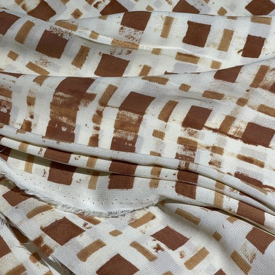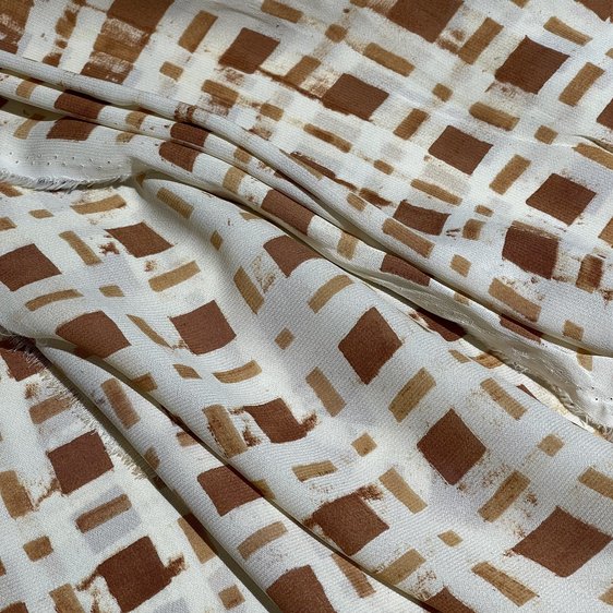 Итальянская вискоза бело-коричневого цвета с классическим клетчатым узором (артикул 125665) — это элегантная и универсальная ткань для создания стильных, сдержанных и уютных образов. Материал обладает мягкой матовой фактурой с легким креповым эффектом, что обеспечивает ему отличную драпируемость и пластичность. Контрастный клетчатый рисунок, сочетающий белый и насыщенный коричневый, добавляет ткани графичности, теплоты и timeless-актуальности, делая ее идеальным выбором для одежды в стилях кэжуал, smart casual, кантри или для создания школьной/университетской формы. Высокая воздухопроницаемость натуральных вискозных волокон гарантирует комфорт в носке в демисезонный период. Ткань подходит для пошива платьев, юбок, брюк, блузок, жилетов и легких пиджаков. Она устойчива к пиллингу, что сохраняет четкость геометрического узора. Полупрозрачность материала требует использования подкладки.