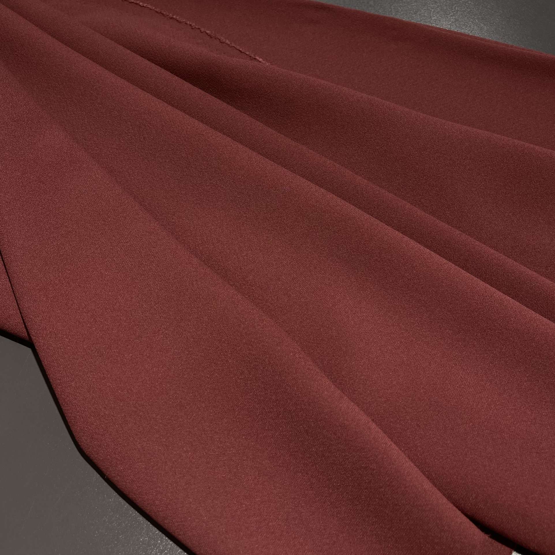 Итальянская вискоза в глубоком бордовом оттенке (артикул 125689) — это ткань для создания элегантных, сдержанных и одновременно роскошных образов. Материал обладает благородной матовой фактурой с легким креповым эффектом, что придает ему пластичность и отличную драпируемость. Насыщенный бордовый цвет, близкий к оттенку вина, выглядит изысканно и универсально, подходя как для осенне-зимнего, так и для демисезонного гардероба. Высокая воздухопроницаемость вискозных волокон обеспечивает комфорт в носке. Ткань устойчива к пиллингу, что сохраняет ее безупречный вид даже при активной эксплуатации. Эта вискоза идеально подходит для пошива платьев-футляров, блузок с драпировкой, юбок-карандашей, брюк и стильных жакетов в деловом или кэжуал стиле. Полупрозрачность материала требует использования подкладочной ткани для большинства моделей.